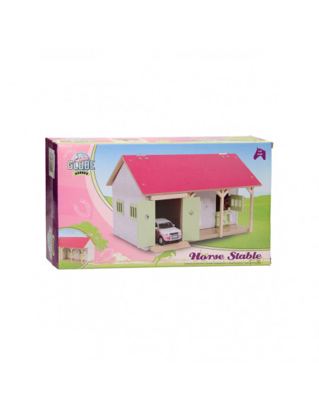 Kids Globe roze paardenstal met 2 boxen en berging 1:32 Het dak van de paardenstal kan opengeklapt worden, zodat er ook makkelijk paarden in de boxen gezet kunnen worden. De deurtjes van de boxen en berging kunnen open.