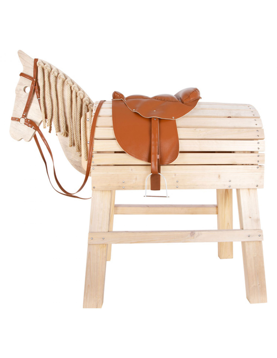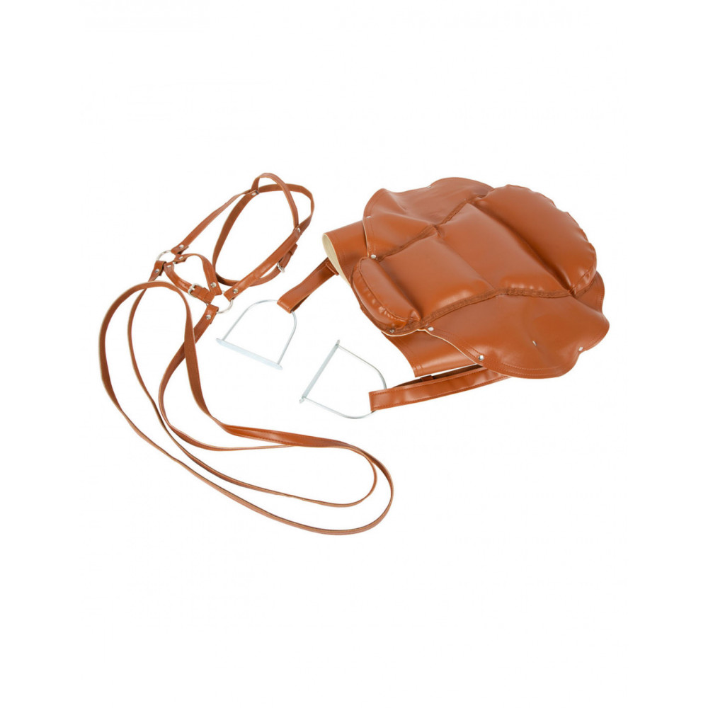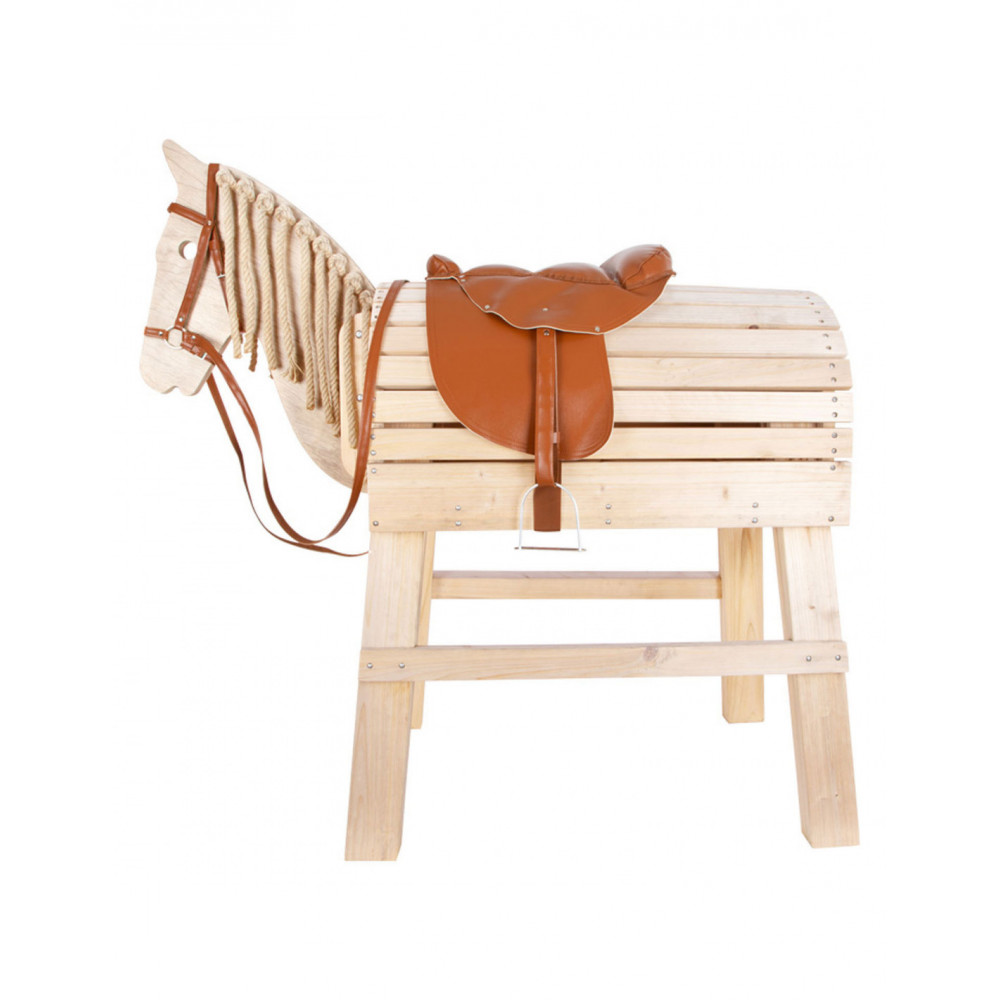 Paardentuig met zadel voor kinderen. De paardenteugel en zadel zijn gemaakt van imitatieleer. Het paardentuig en de zadel zijn geschikt voor houten speelgoed paarden. lengte paardenteugels: 115 cm.