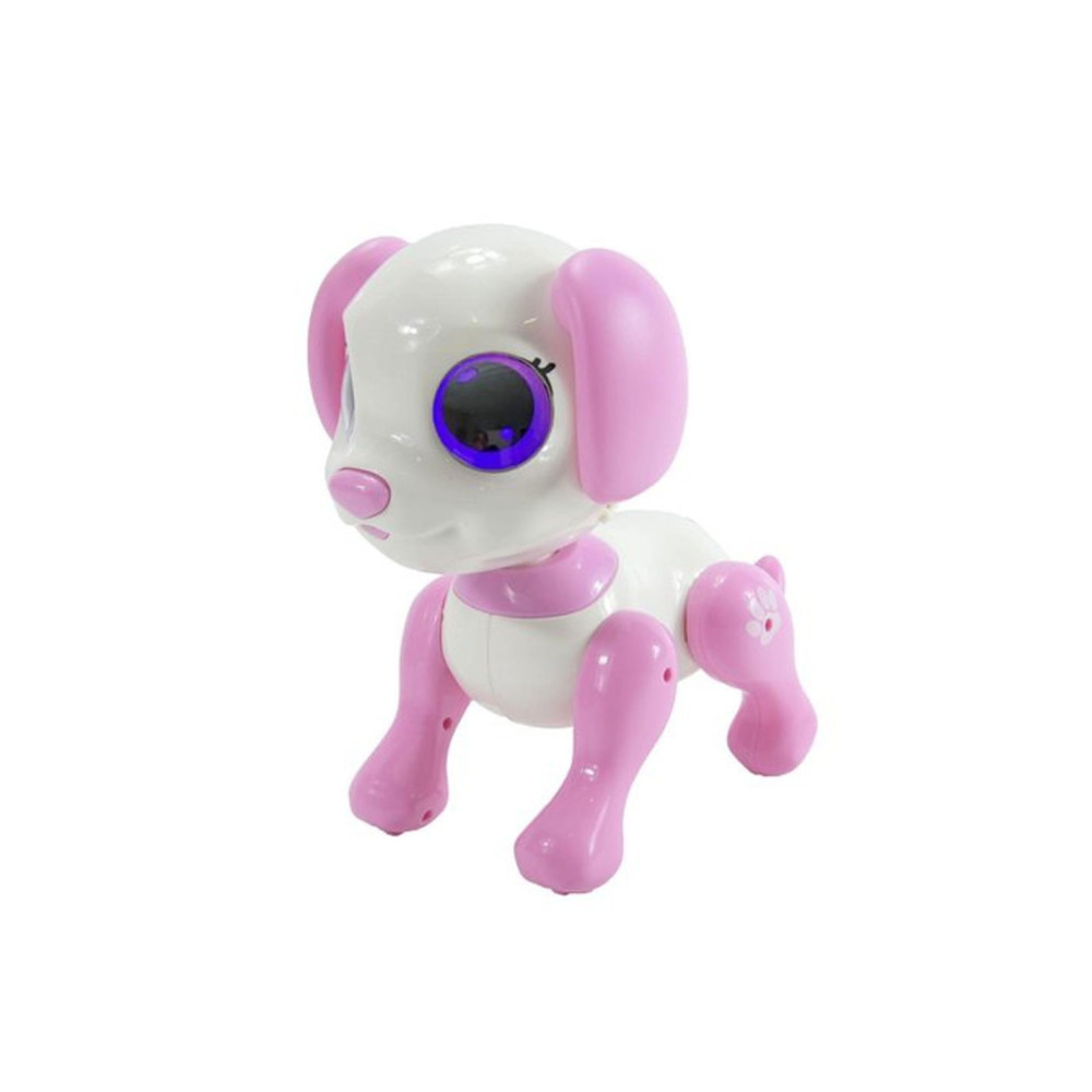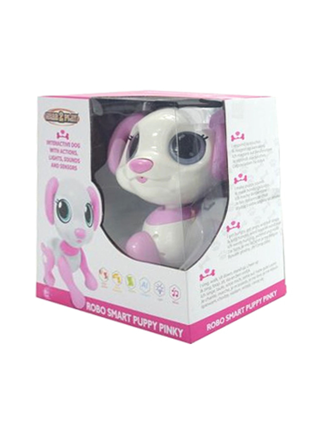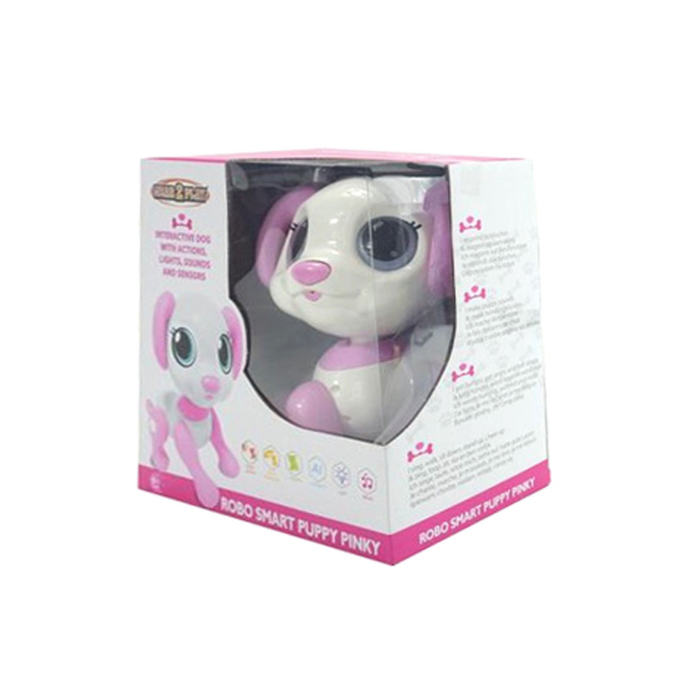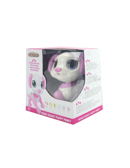 De schattige Robo Smart Puppy Pinkie is een interactieve hond voorzien van led verlichte ogen, verschillende geluiden en sensoren, waardoor Smart Puppy zal reageren op geluid en aanraking. De Smart Puppy met roze accenten en lieve hondenoogjes kan lopen, zitten, opstaan en maakt hondengeluiden. Als ze honger krijgt is ze niet zo blij en moet je haar onder zijn kin blijven aaien tot zij vol zit. Dan is ze weer vrolijk en zal ze voor je gaan dansen! De vrolijke Smart Puppy wil altijd met jou spelen! Afmeting: 22 x 12 x 20 cm (lxbxh). Batterij informatie: 3 x AA batterijen (niet meegeleverd). Leeftijdsindicatie: 5 jaar+.
