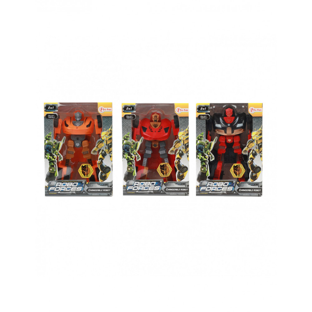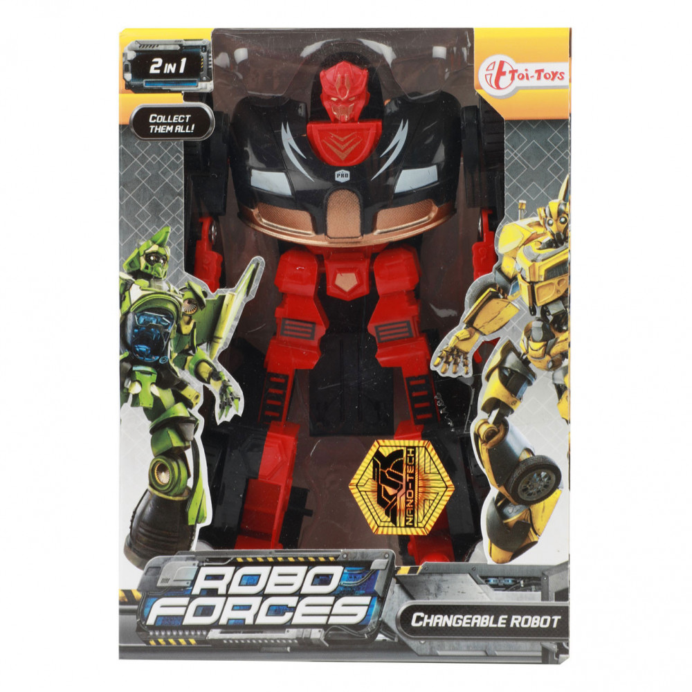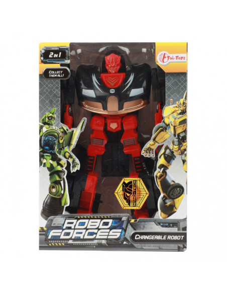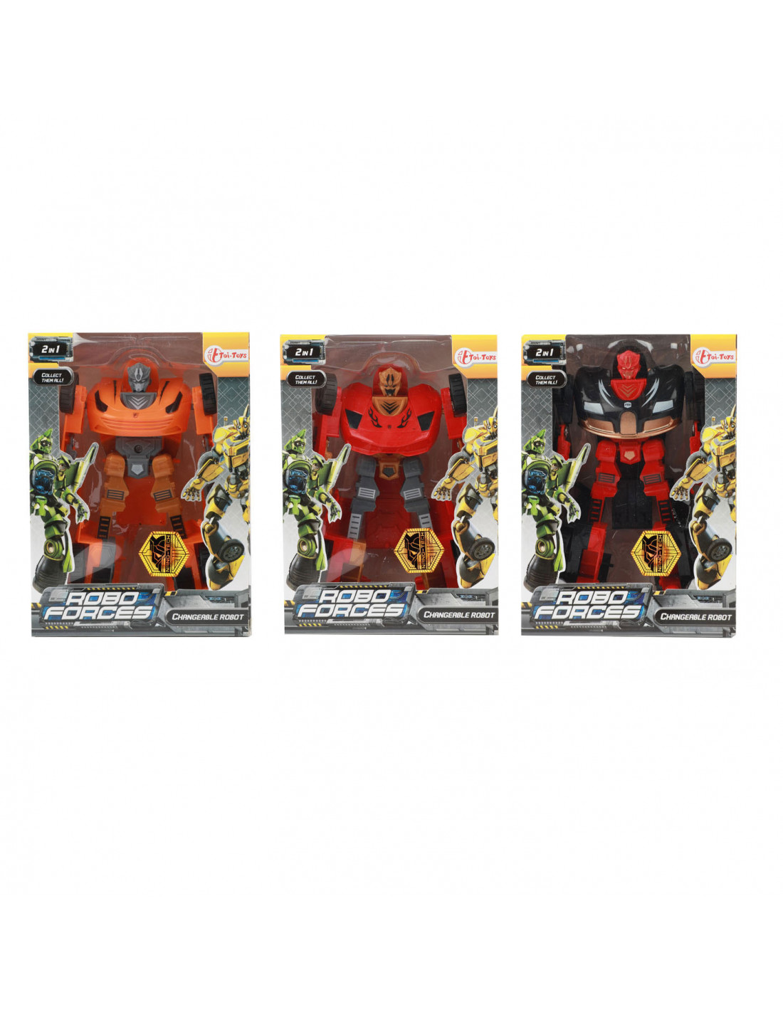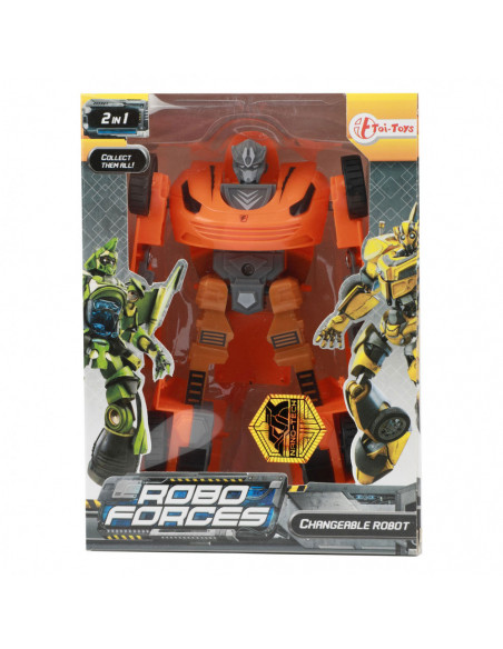 Deze ROBOFORCES robot zier er heel stoer uit, klaar voor het gevecht. Maar hij heeft een extra verrassing. Met een paar handelingen verander je hem zomaar in een superauto. Zo kan hij er snel vandoor, en niemand die hem ziet! Er zijn 3 verschillende versies te verkrijgen.