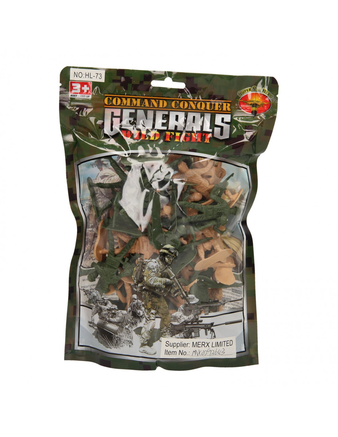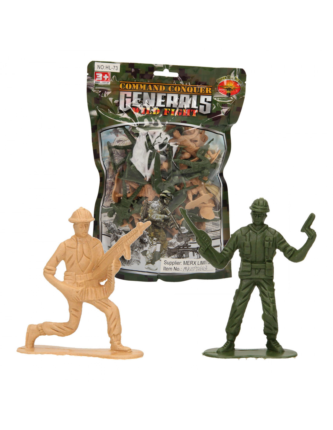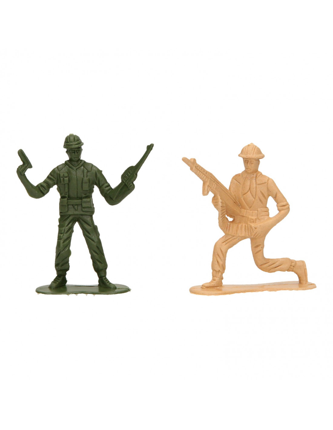 Soldaatjes in camouflage kleuren. Afmeting: 5 bij 3 bij 2 cm. Geschikt voor kinderen van 3 tot 6 jaar oud. Gemaakt van kunststof.