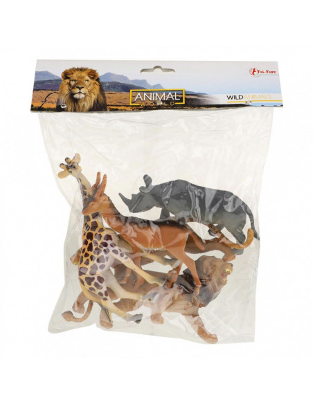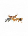 Een set van 5 fraaie natuurgetrouwe plastic wilde dieren: een leeuw, giraffe, antilope, neushoorn en tijger.