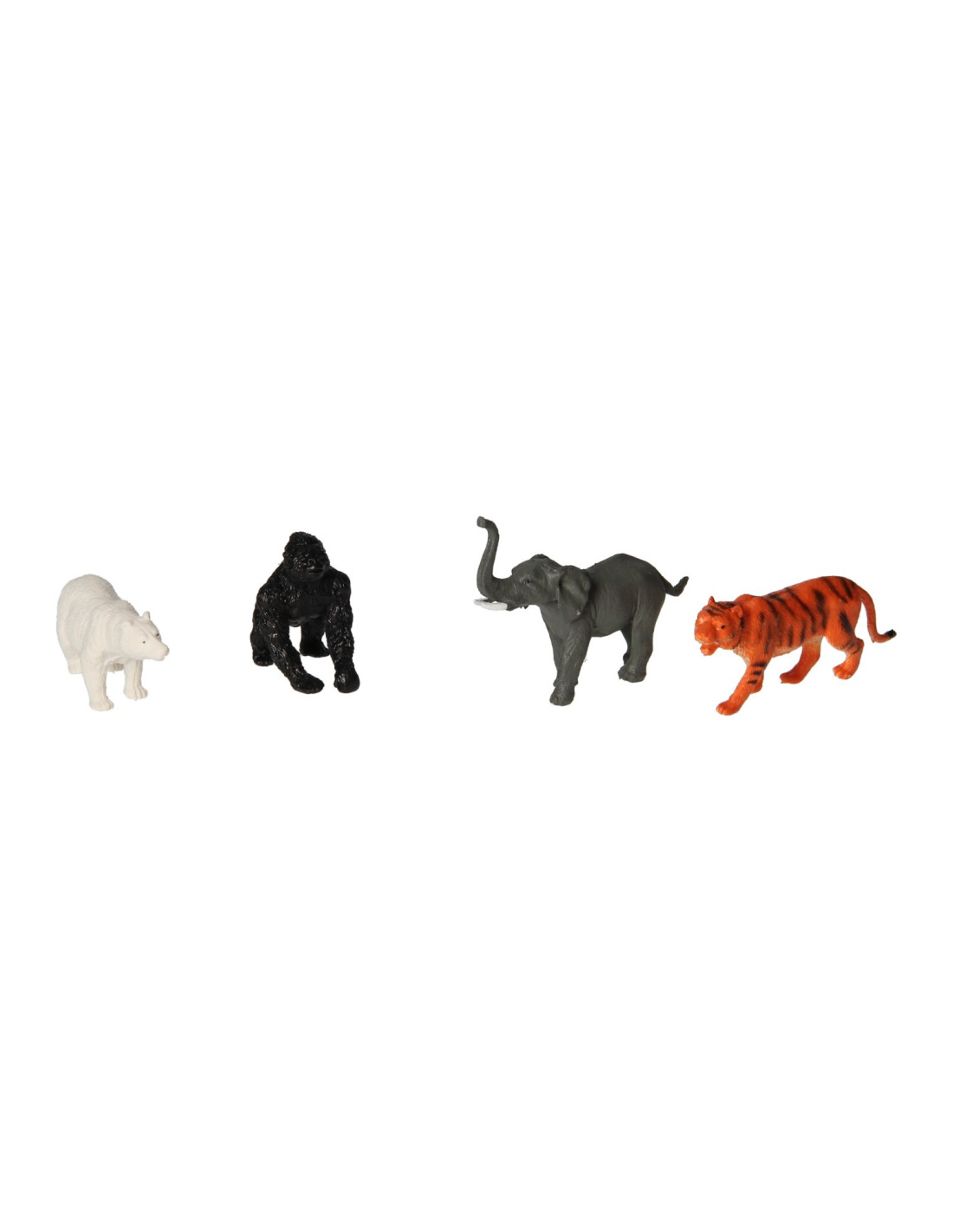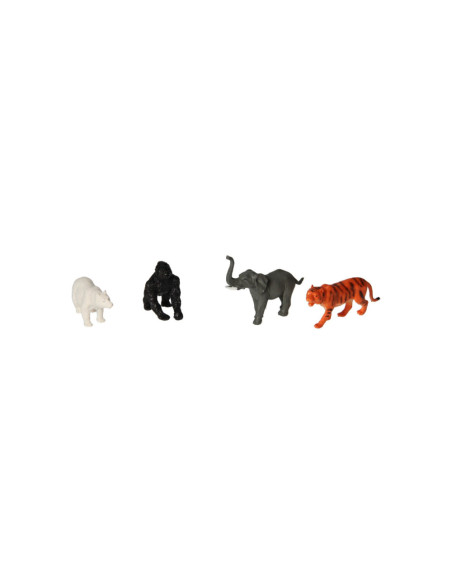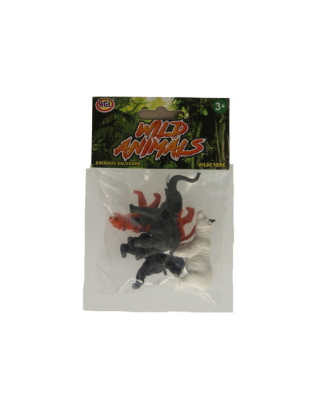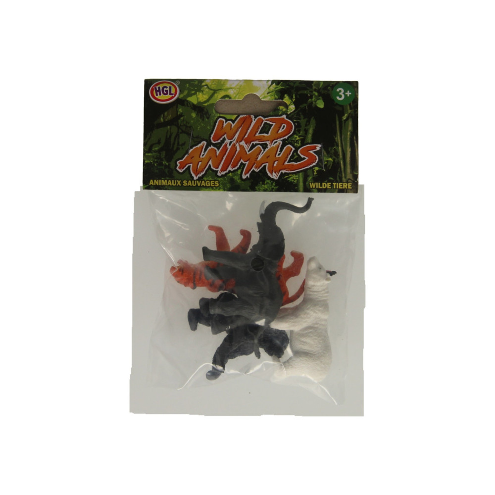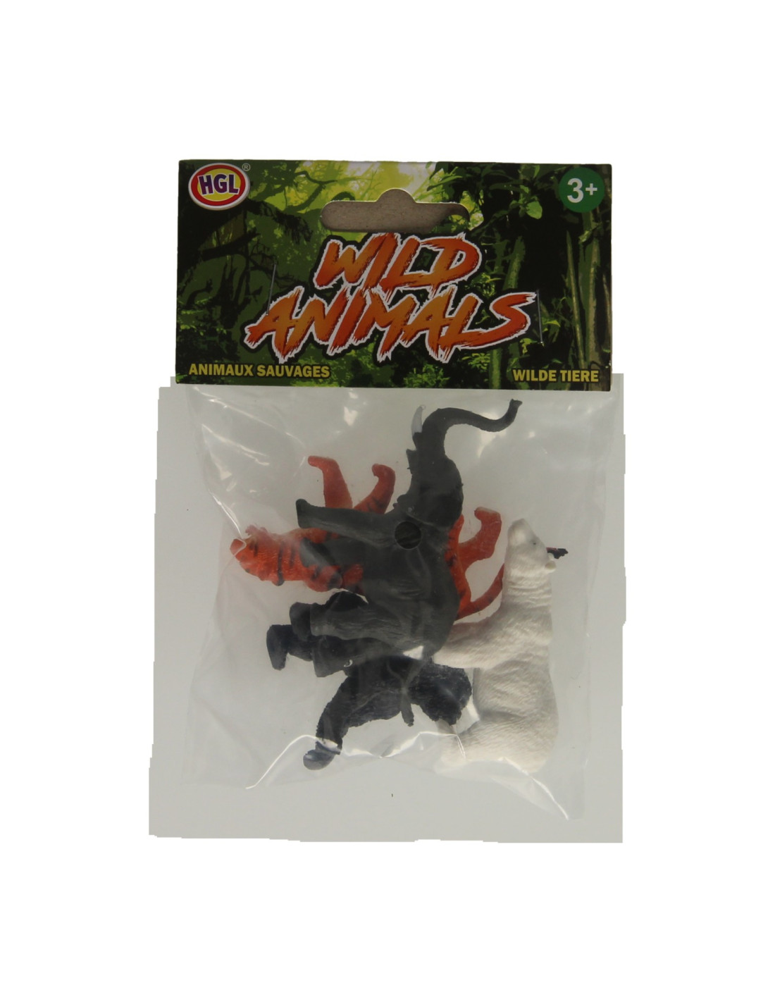 Zakje met 4 speelfiguren van wilde dieren, elk ca. 4 centimeter groot. Geschikt vanaf 3 jaar.