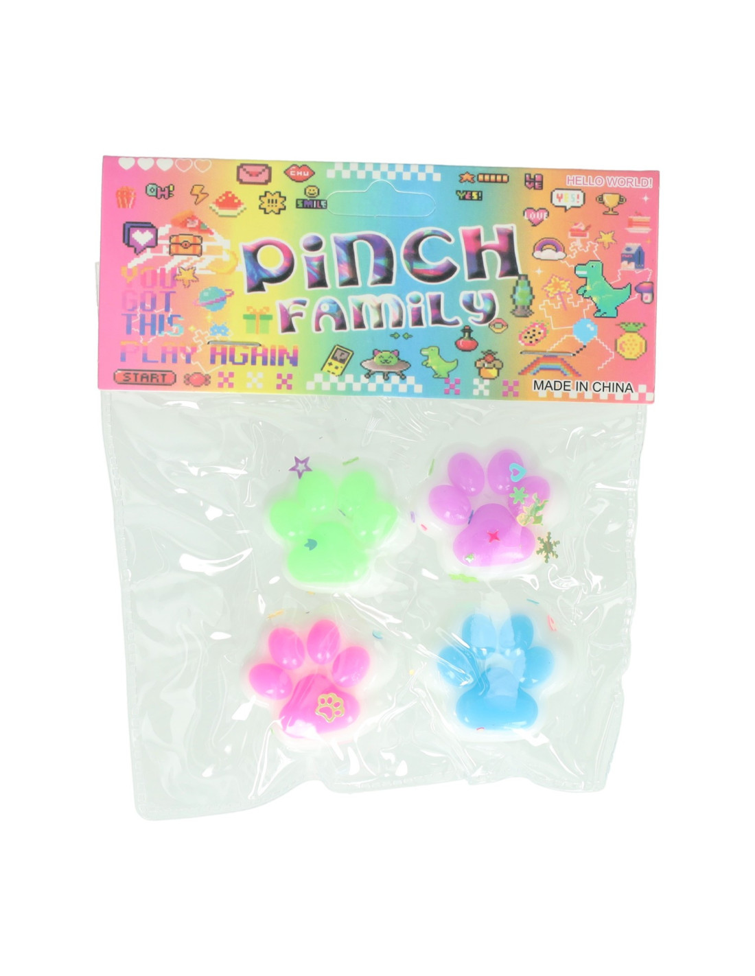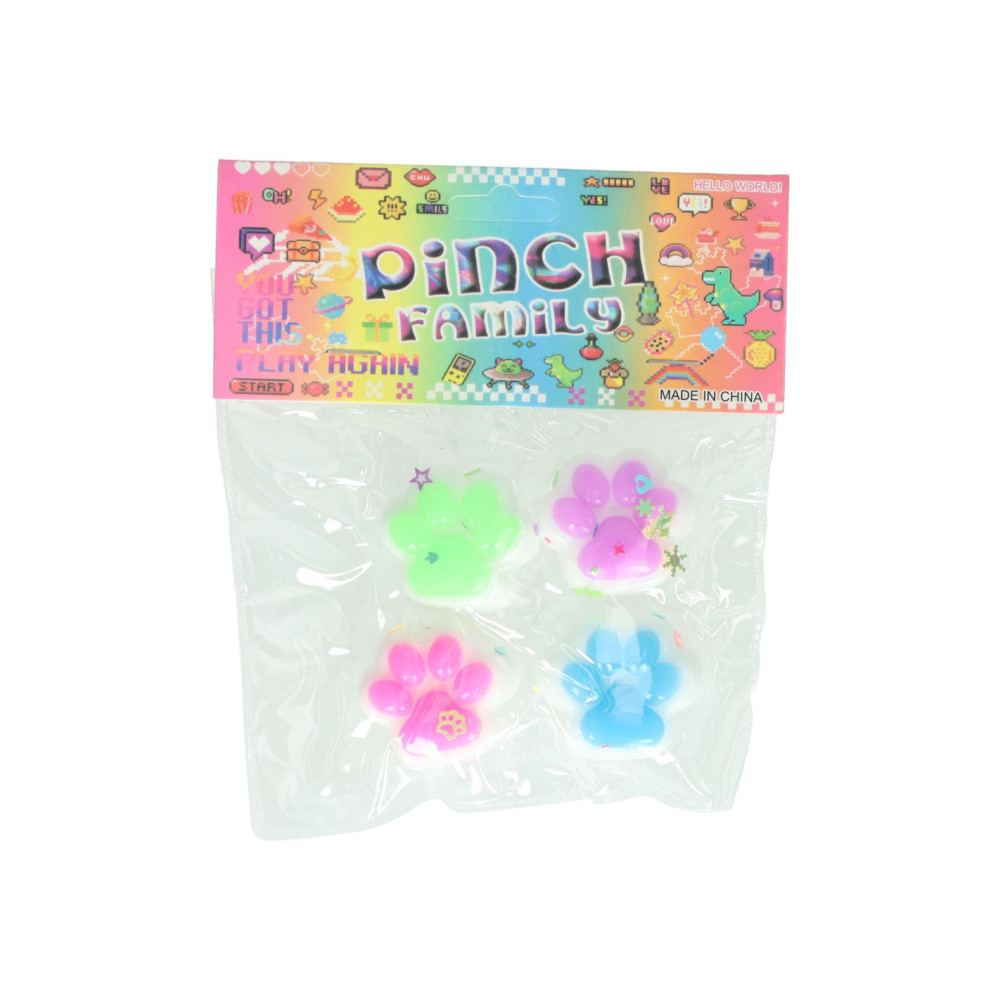 Set van 4 Pinch Family Squishy pootjes van ca. 7,5 x 6,5 cm per stuk. Gemaakt van kunststof met zachte textuur, in diverse kleuren. Geschikt voor kinderen vanaf 3 jaar.
