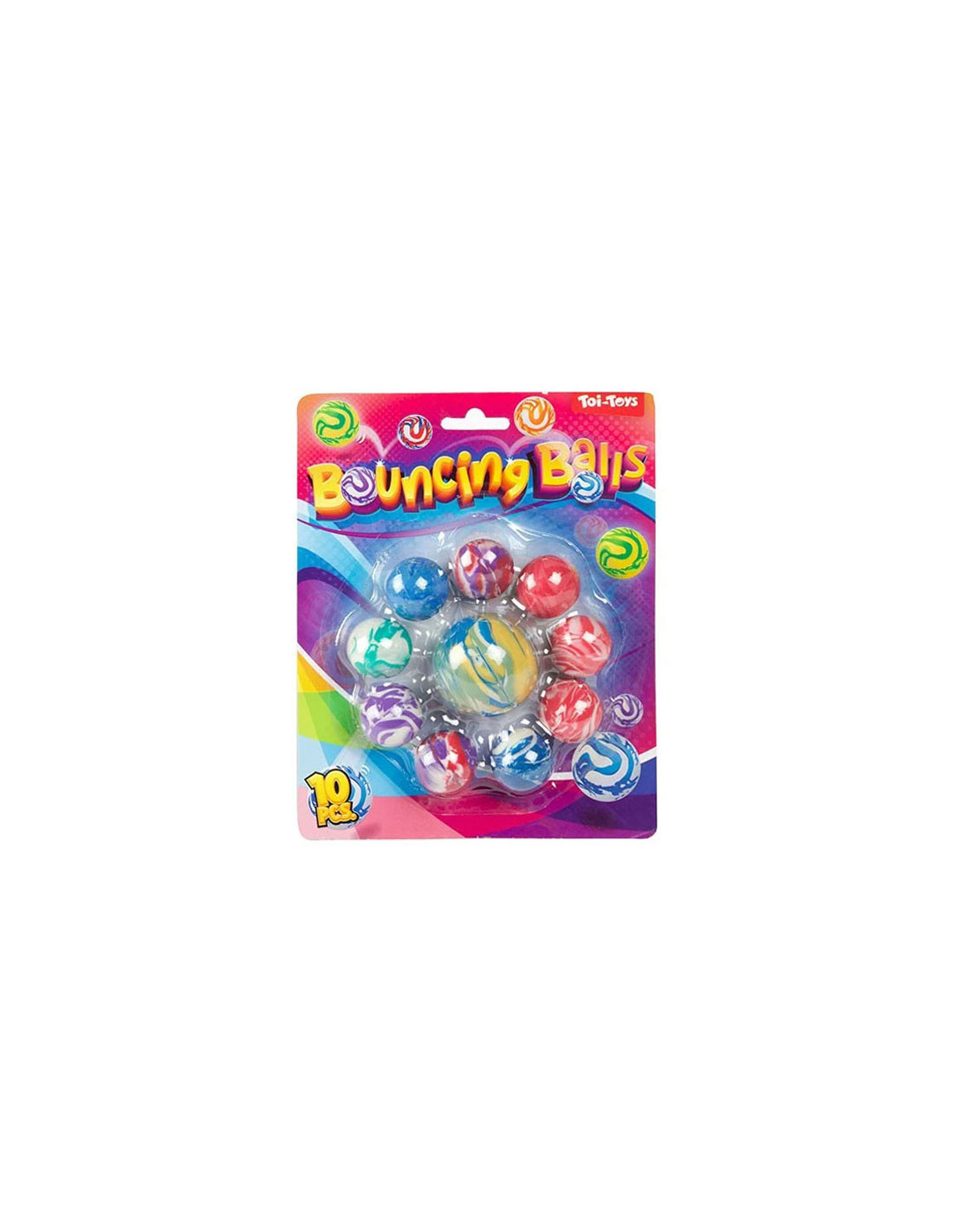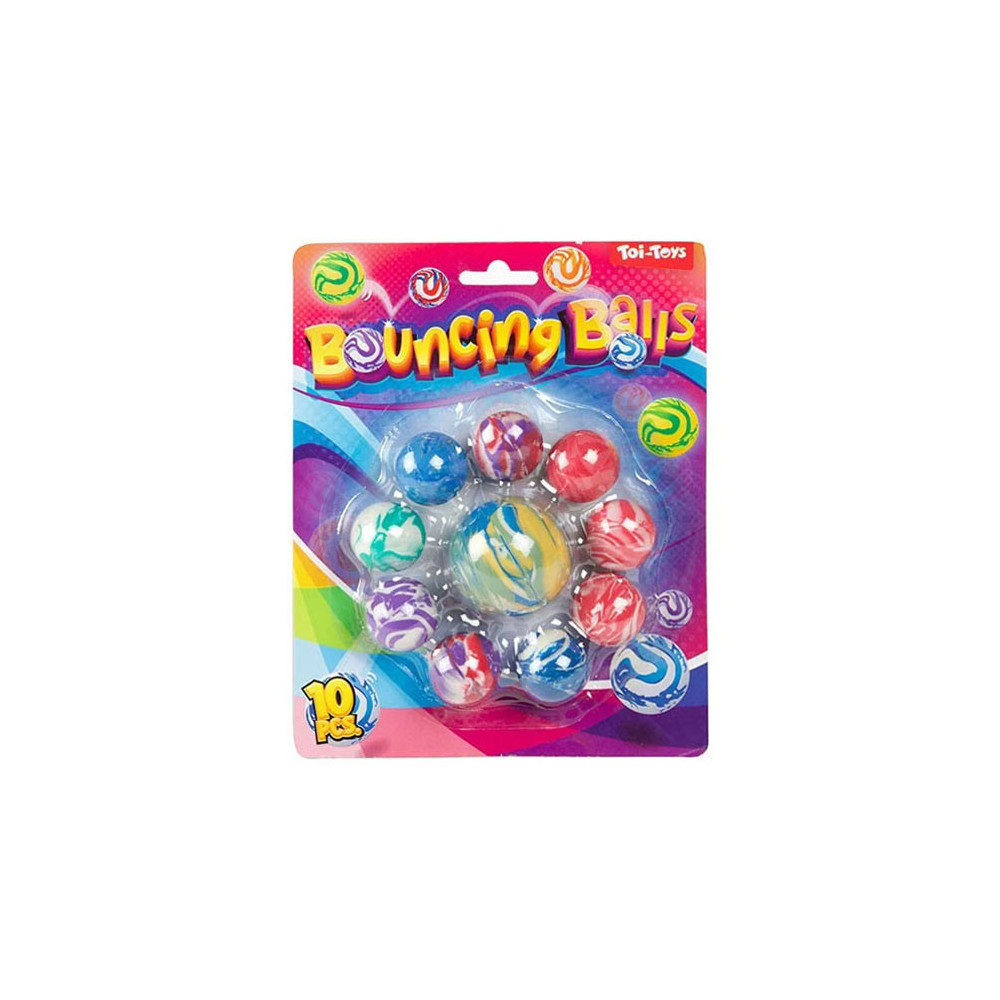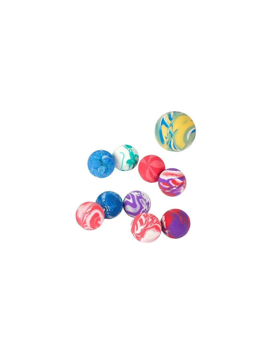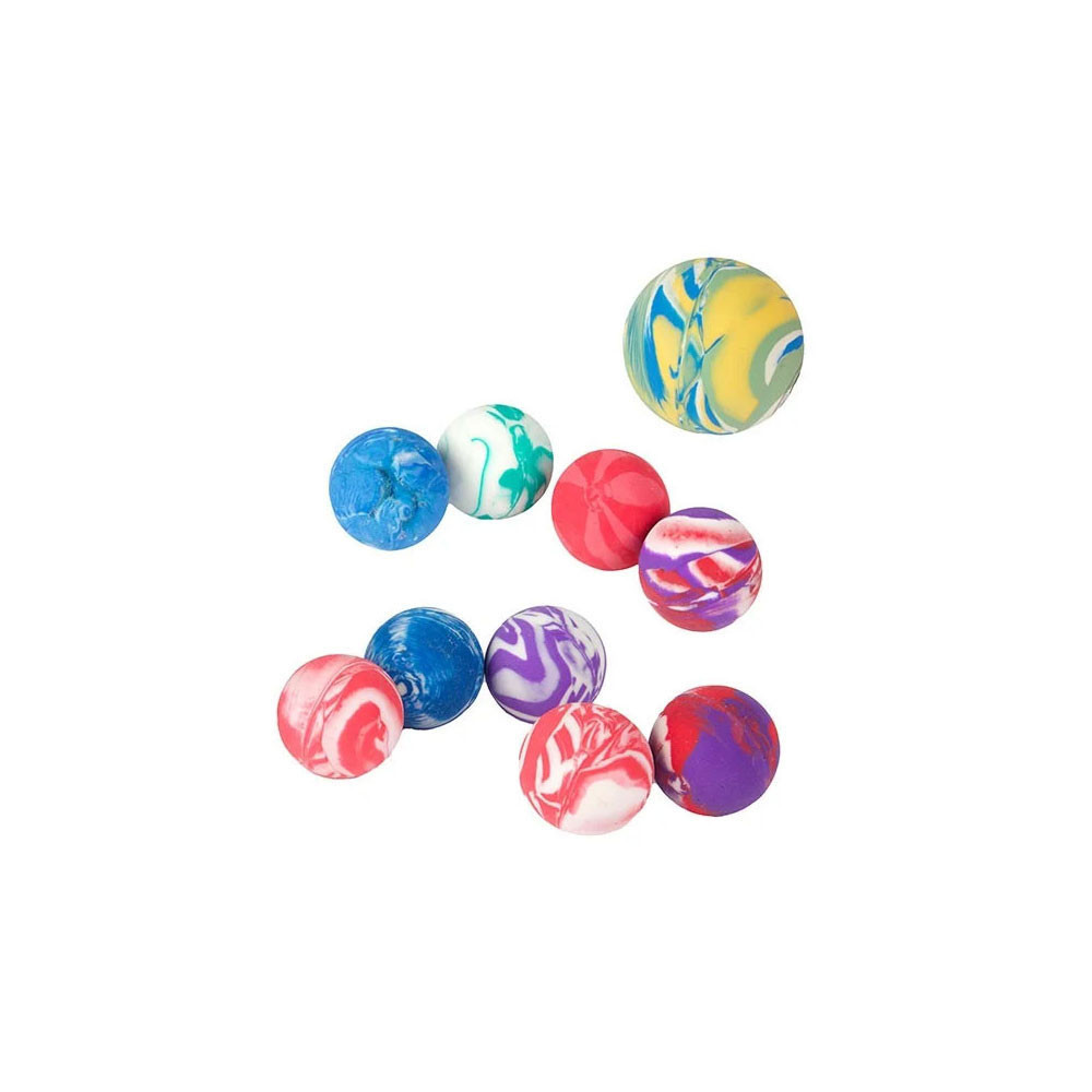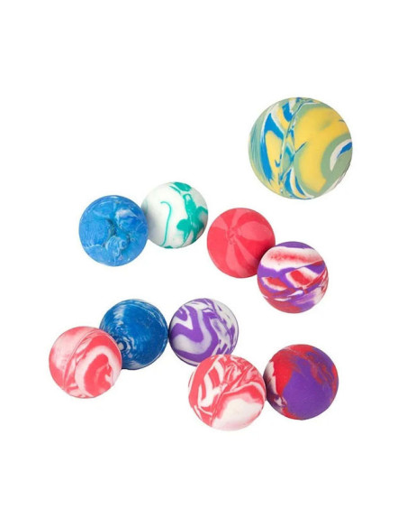 Set van 10 stuiterballen (waarvan 1 XL) met kleurrijk marmerpatroon. Geschikt vanaf 3 jaar.
