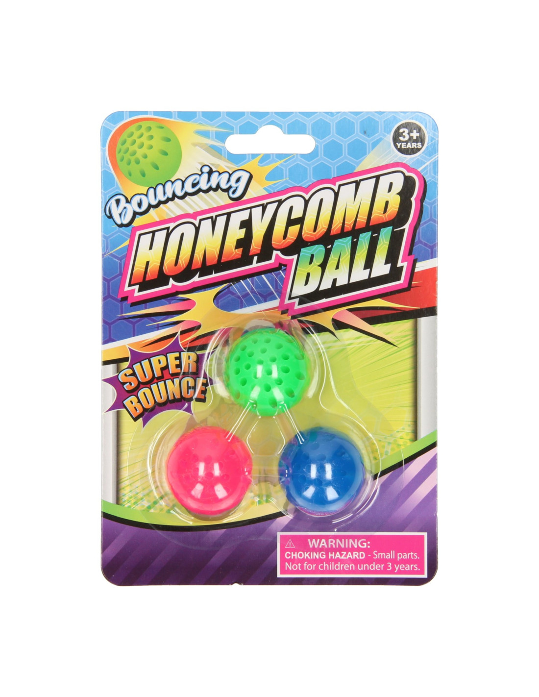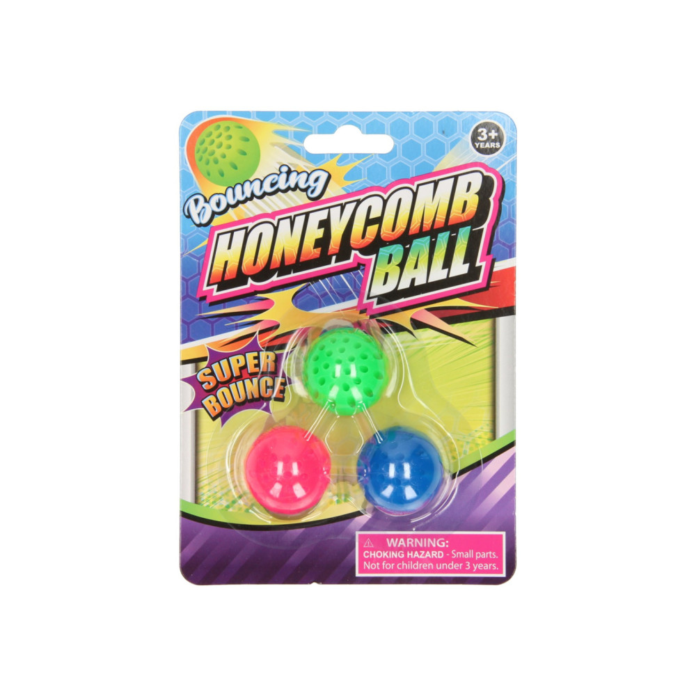 Set van 3 gekleurde honingraat stuiterballen, die dankzij de inkepingen superhoog stuiteren! De ballen zijn 3 centimeter groot. Geschikt voor kinderen vanaf 3 jaar.