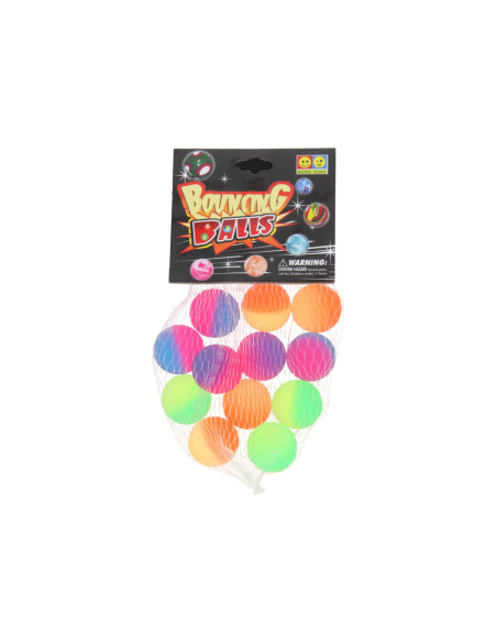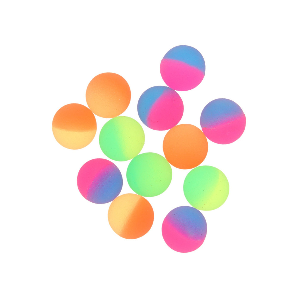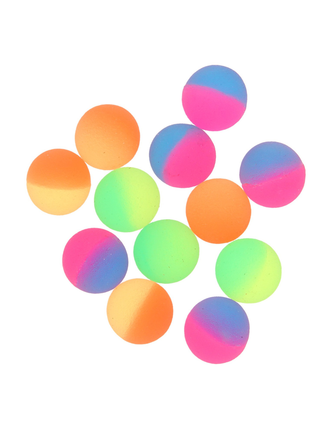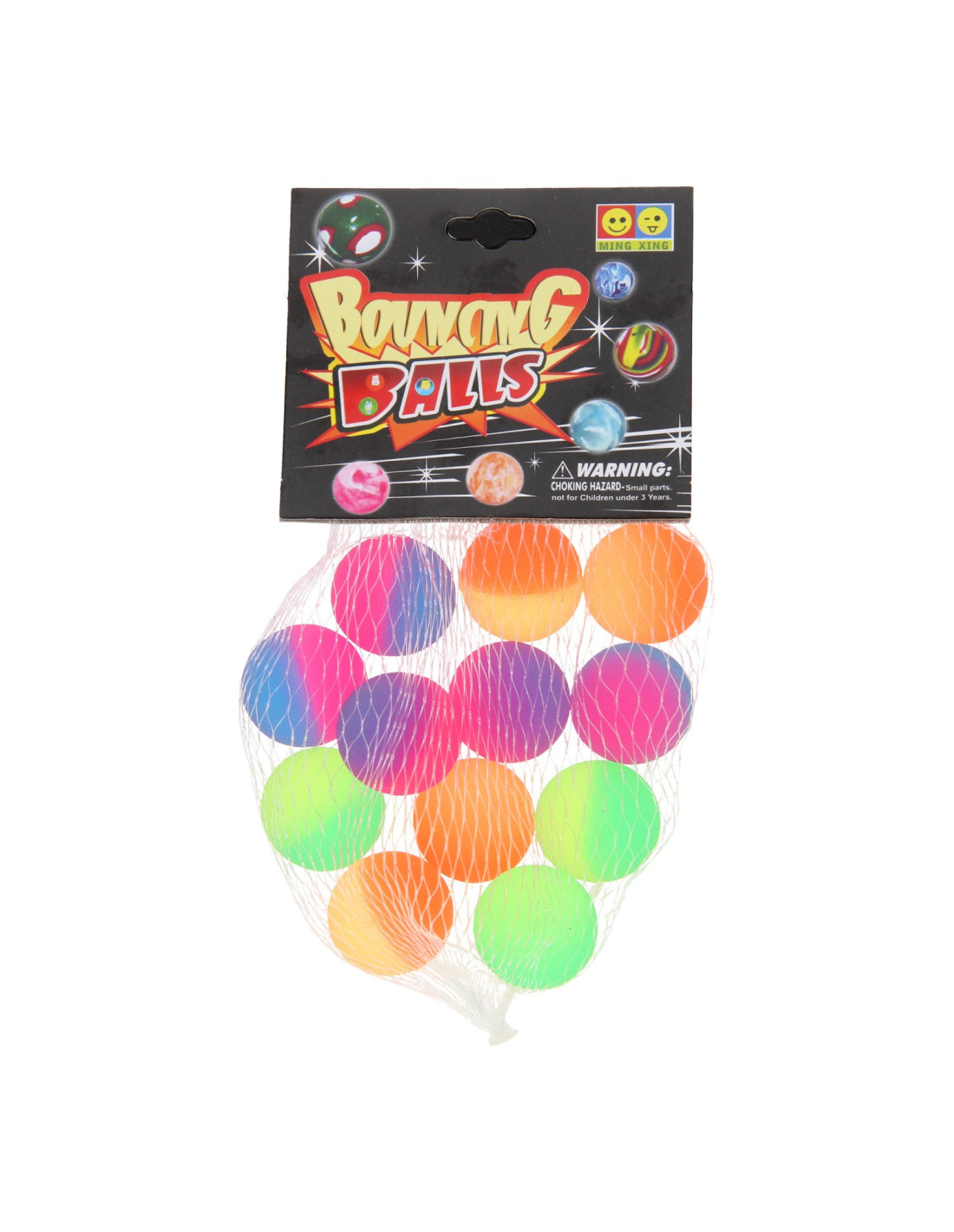 Set van 12 stuiterballen met vrolijke kleuren. De stuiterballen hebben een doorsnede van 2 cm.