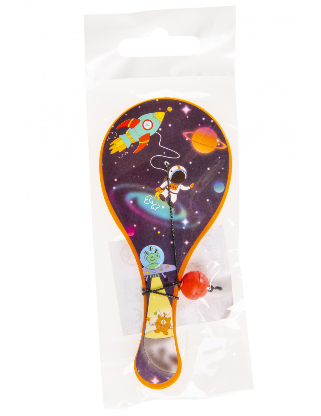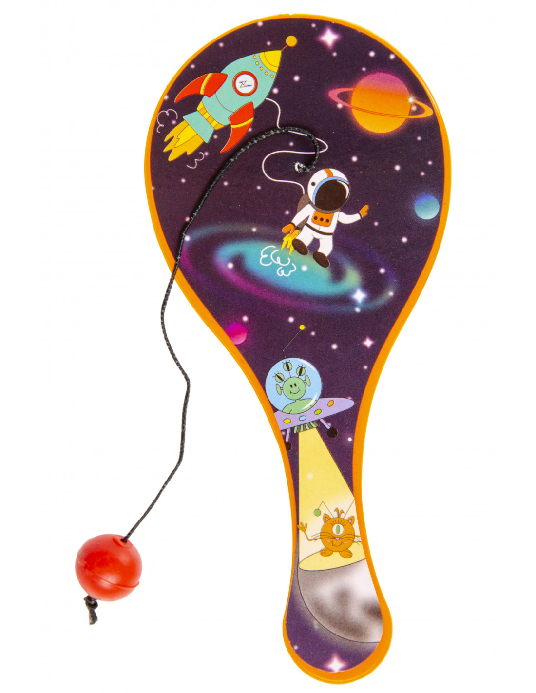 Ben je op zoek naar een leuk spelletje om te spelen met vrienden of om jezelf uit te dagen? Dan is dit stuiterballetje met batje met een ruimtevaart thema perfect voor jou! Door het elastieken koord zit het balletje vast aan het batje, waardoor je een uitdagend spel kunt spelen en je oog-handcoördinatie kunt trainen.