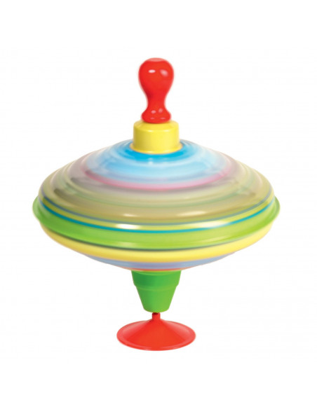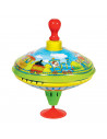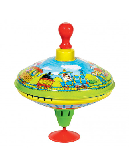 Trek aan de houten nop van deze tol en zie hoe de metalen tol super snelle rondjes begint te draaien op zijn voet. De print van de vrolijke trein op de buitenzijde draait net zo snel in het rond.