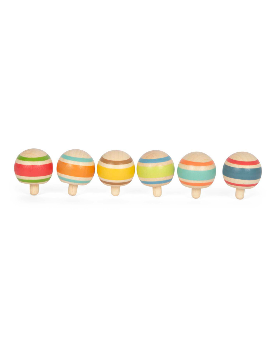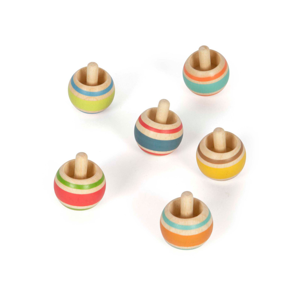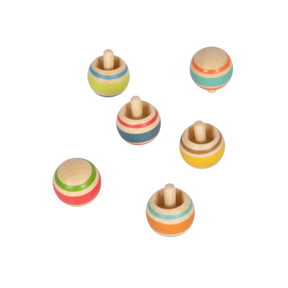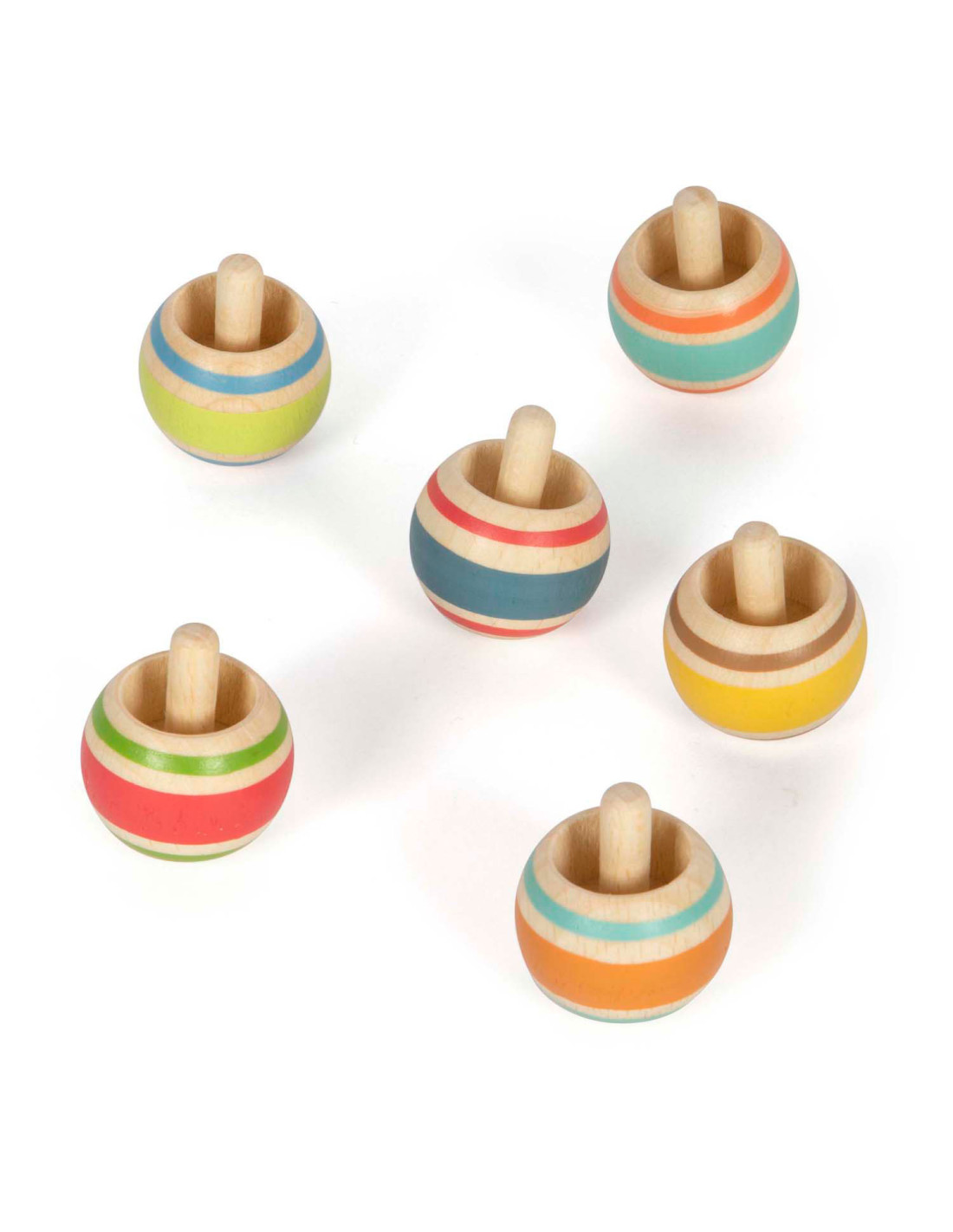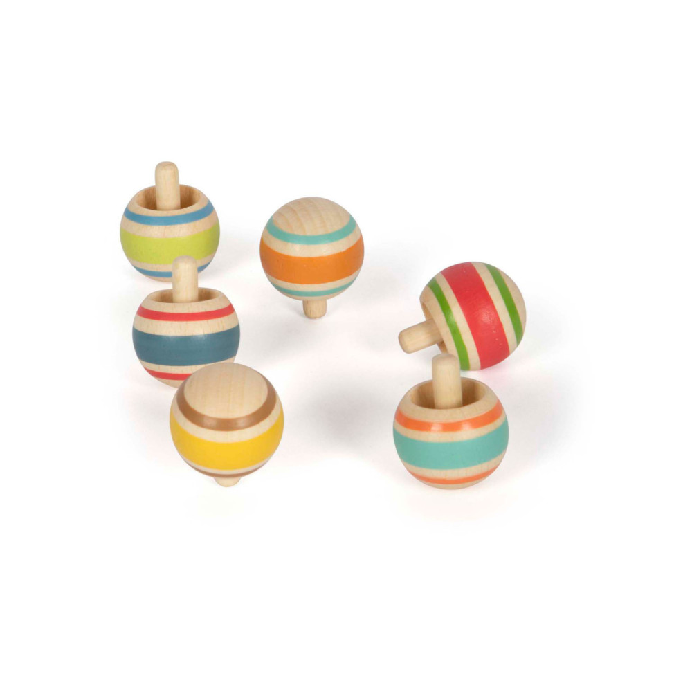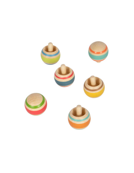Houten tollen set. In de set zitten 6 tollen om mee te spelen. Geschikt voor kinderen vanaf 3 jaar.