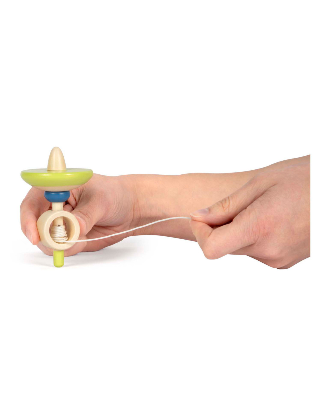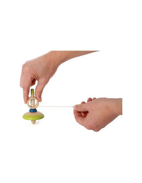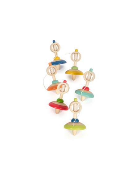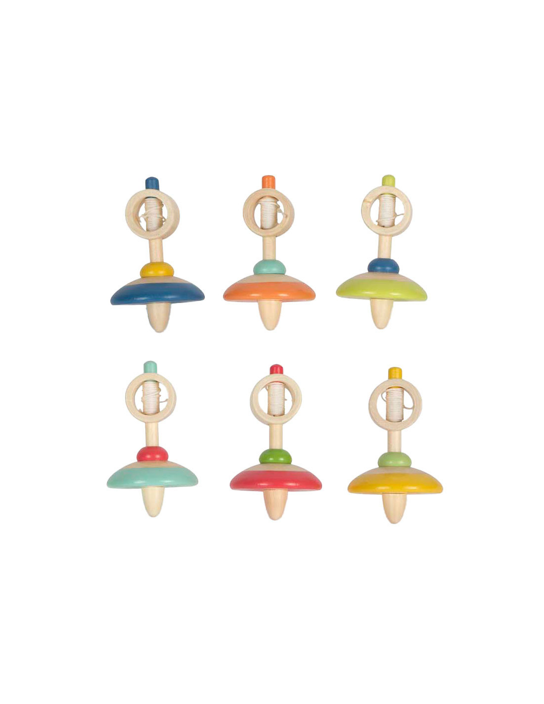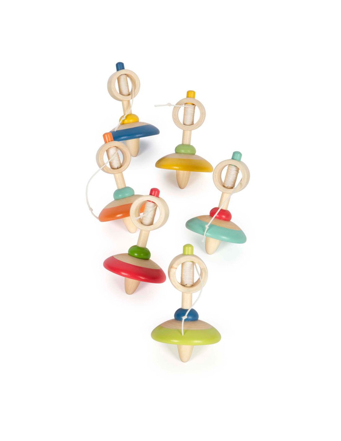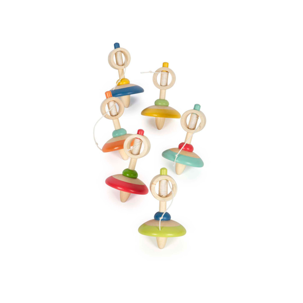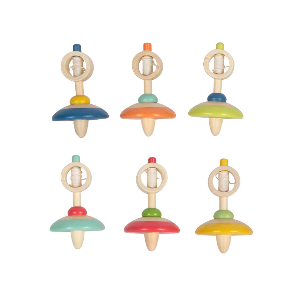 Houten tol met opwindfunctie. In de set zitten 6 tollen. De tollen zijn geschikt voor kinderen vanaf 3 jaar. De tol is circa 5,5 x 5,5 x 9 cm groot.