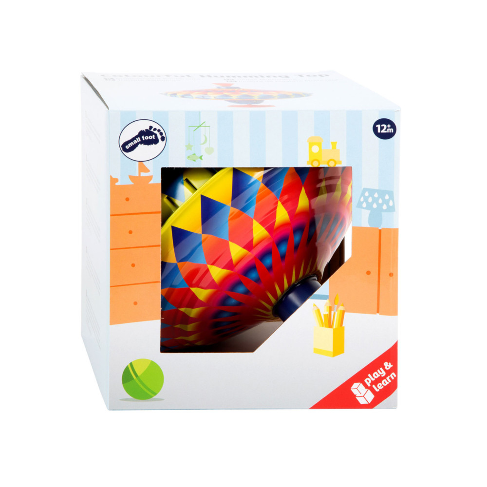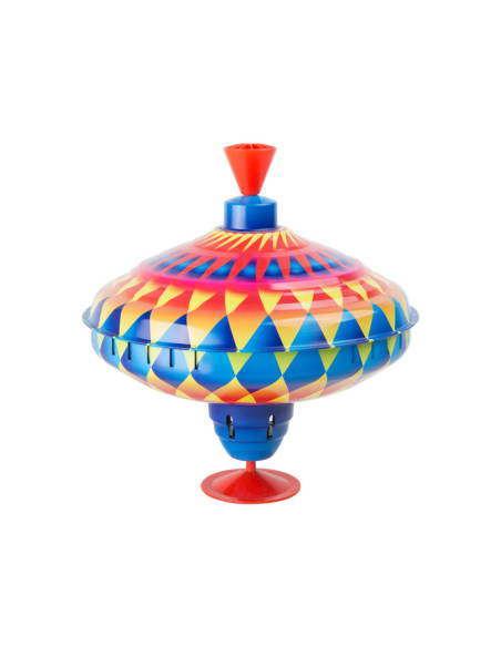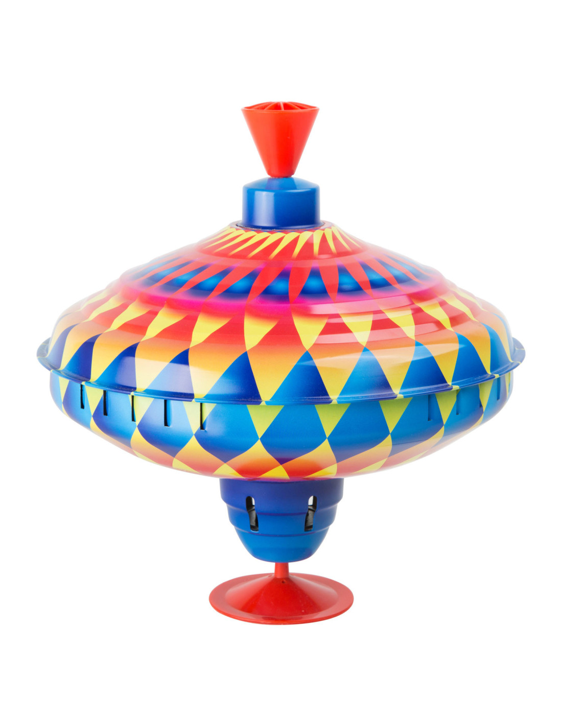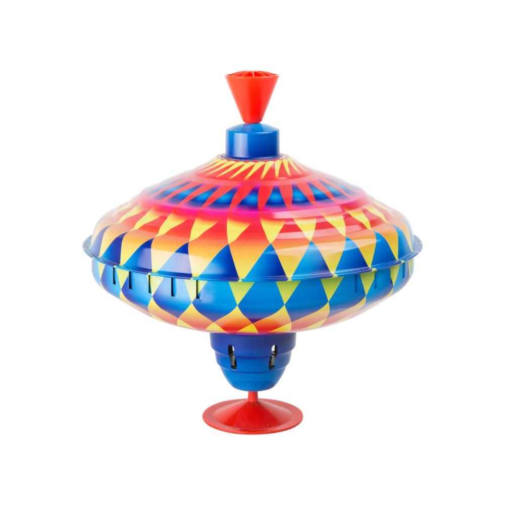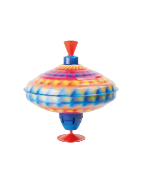 Wie heeft er niet van gehoord: de bromtol? Een geweldig kleurrijk blikken speelgoed dat begint te draaien door op het handvat te drukken en een zoemend geluid maakt. De rubberen basis houdt het op zijn plaats. Een geweldig speelgoed voor kinderen!