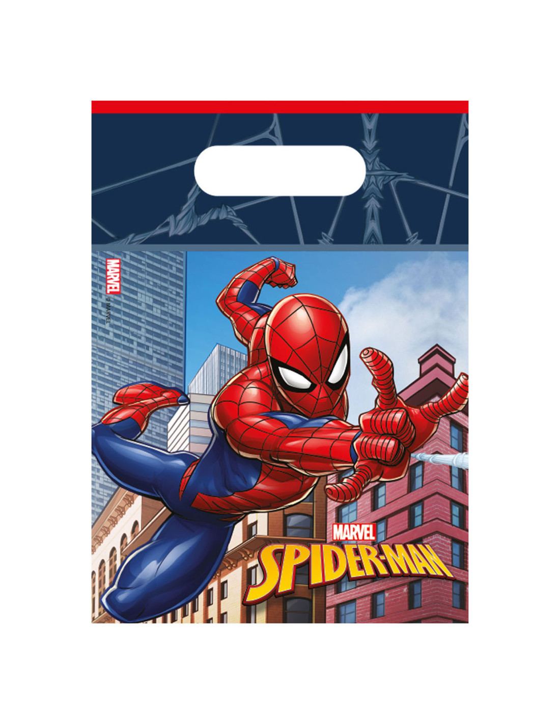 Set van 6 plastic feestzakjes met Spider-Man print en een handvat. Leuk om te combineren met de bijpassende feestartikelen uit de Spider-man feestlijn!