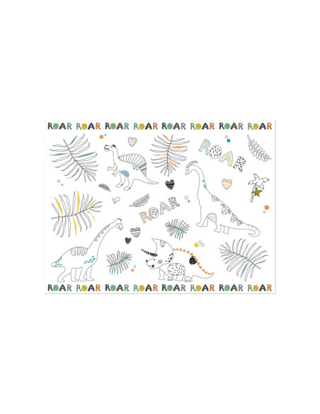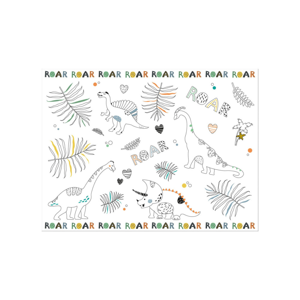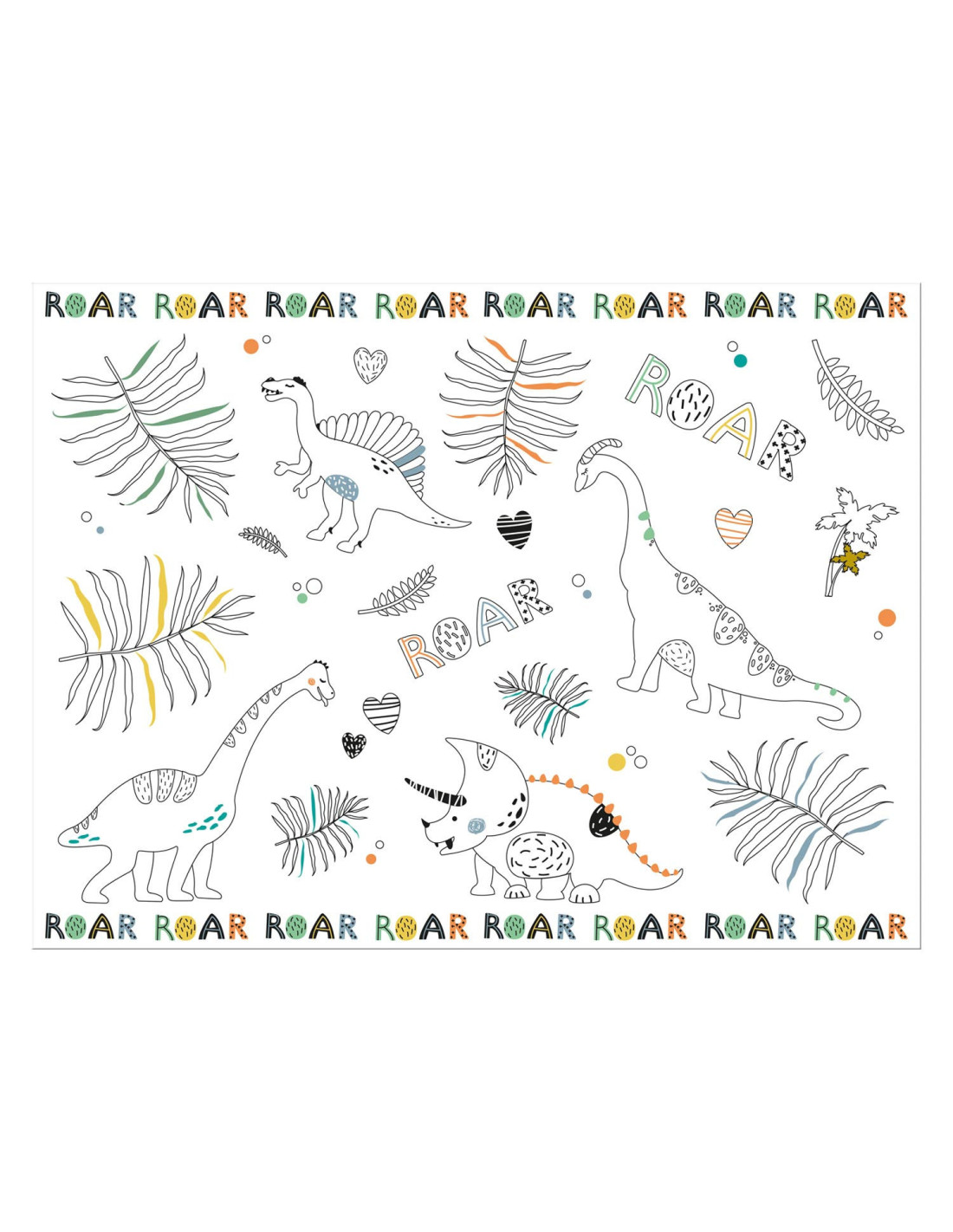 Stoere placematkleurplaten van dinosaurussen. De placemats zijn ongeveer 40 x 30 centimeter groot en gemaakt van papier. In elke verpakking zitten 6 dinosaurus placemats.