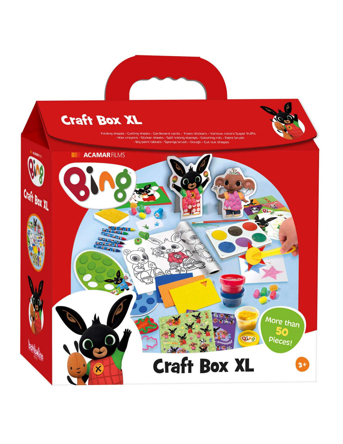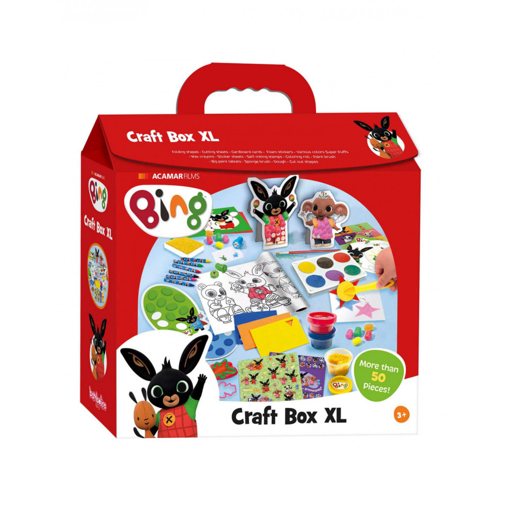 50-delige knutselkoffer van Bing met o.a. waskrijtjes, stickers, verf, klei en speelmais. Geschikt voor kinderen vanaf 3 jaar.