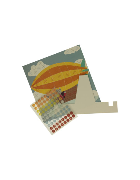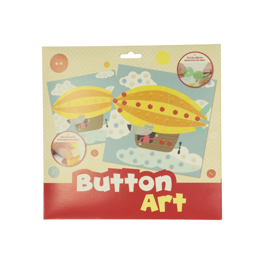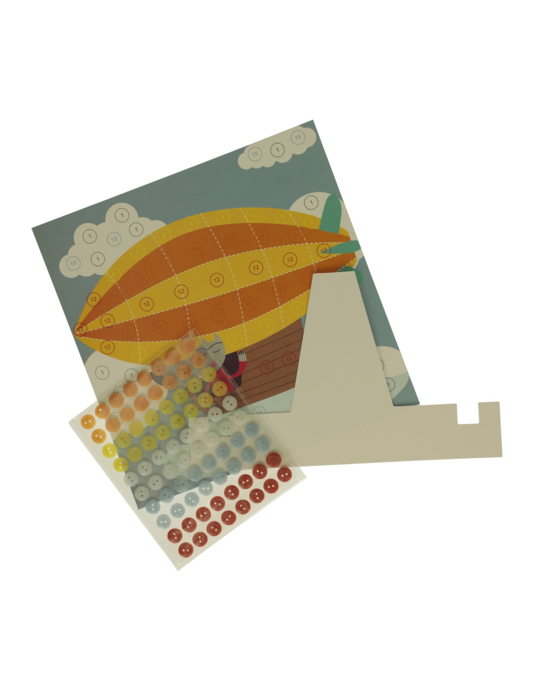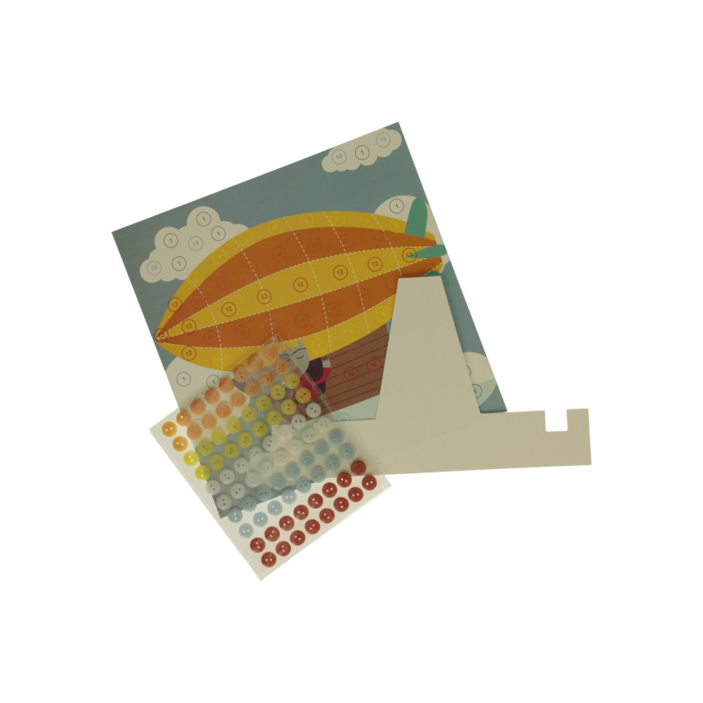 Knutselset waarbij een schilderijtje versiert kan worden met gekleurde knoopjes. In de set zit een kartonnen afbeelding (20 x 20 cm), stickervel met verschillende knoopjes en een kartonnen standaard. De knutselset is geschikt voor kinderen vanaf 3 jaar.