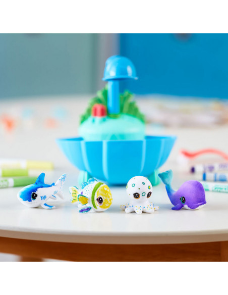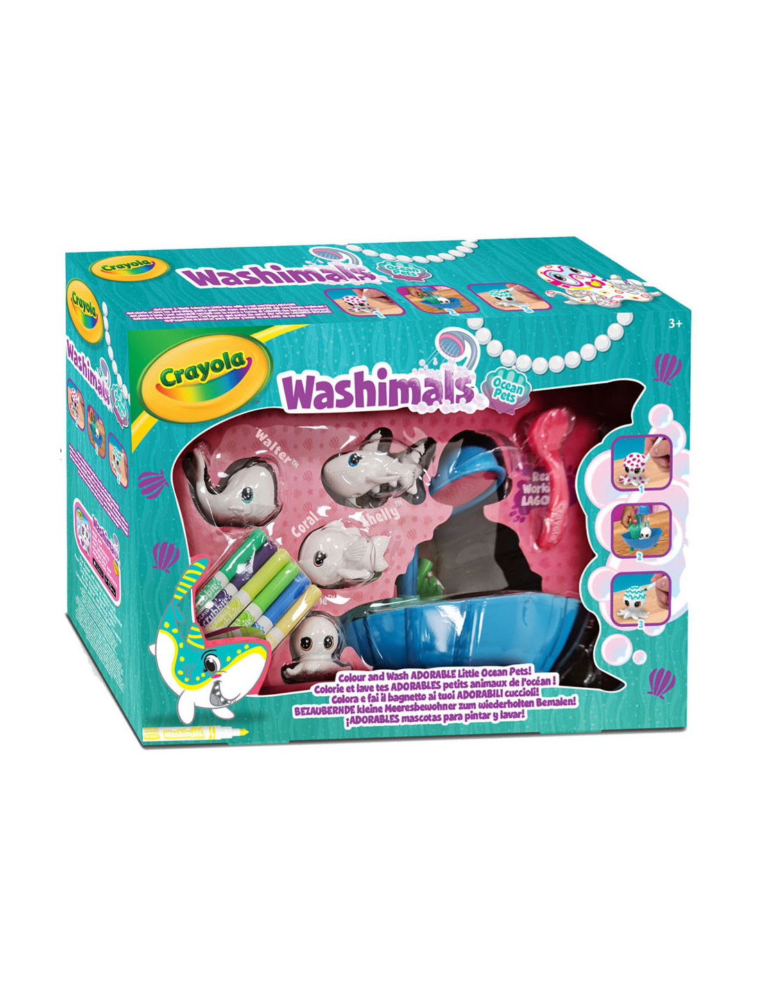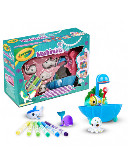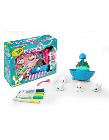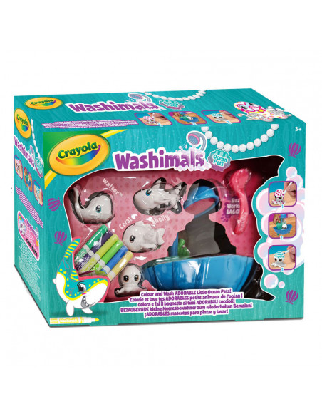 Duik in een nieuw avontuur met de Crayola Washimals Zeedieren Lagune set! Kleur de Washimals dieren in met de afwasbare viltstiften. Was de dieren weer wit in het bad met water. Kleur opnieuw!