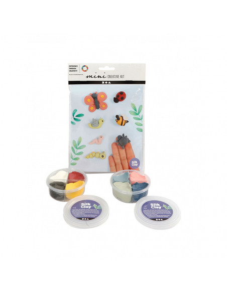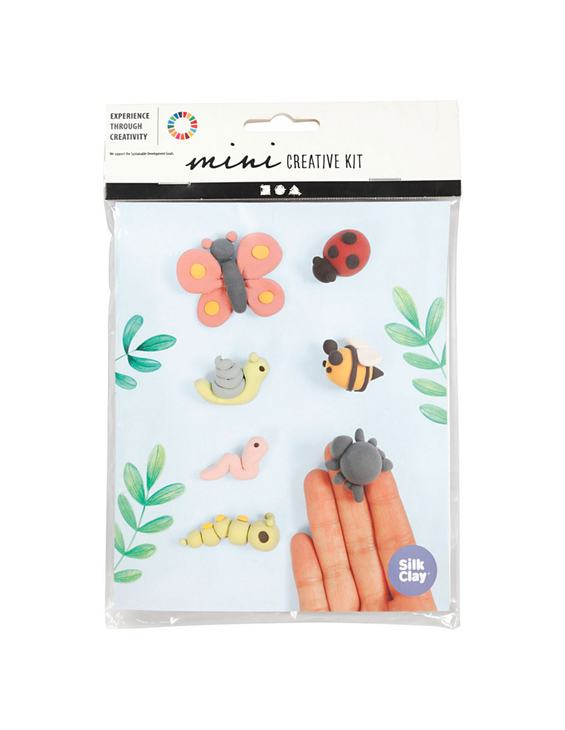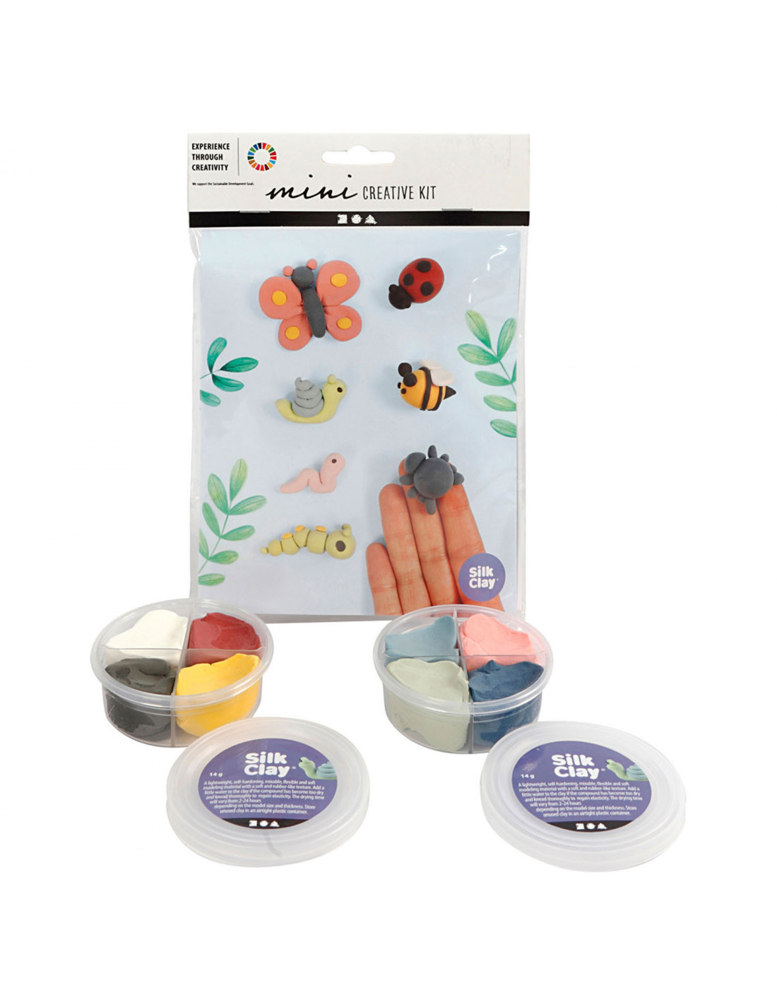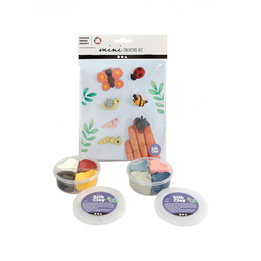 Materialenset voor het boetseren van diverse kleine insecten. Inclusief inspiratie en voorbeelden om lekker aan de slag te gaan. Inhoud: 2 potjes met Silk Clay met elk 4 verschillende kleuren.