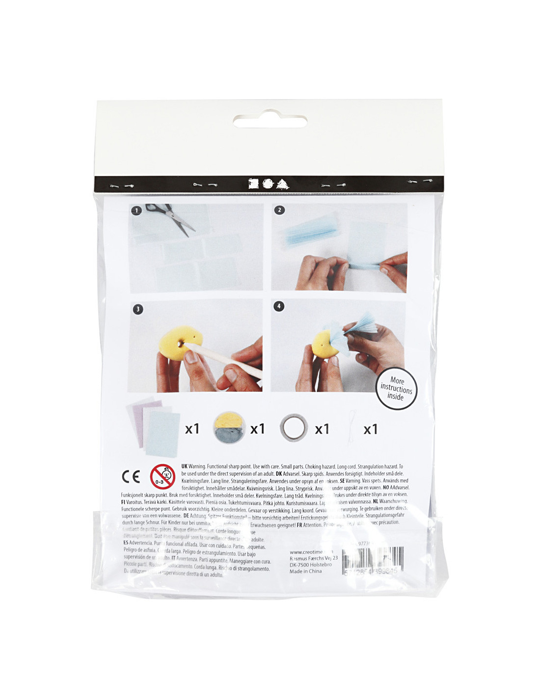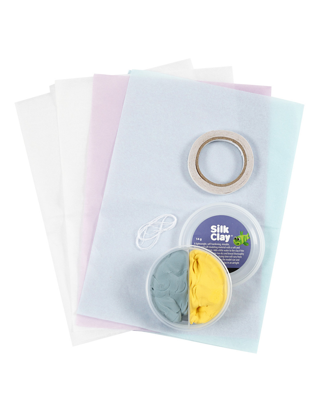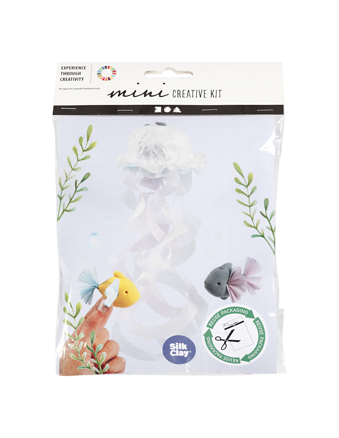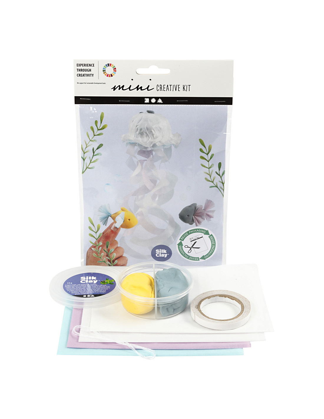 Met deze Creative Kit maak je een kwal en een vis van silky clay en zijdepapier. In het zakje zit alles wat je nodig hebt: Silk Clay in twee verschillende kleuren, vier vellen tissuepapier in verschillende kleuren, zelfklevende tape en draad om op te hangen.
