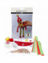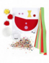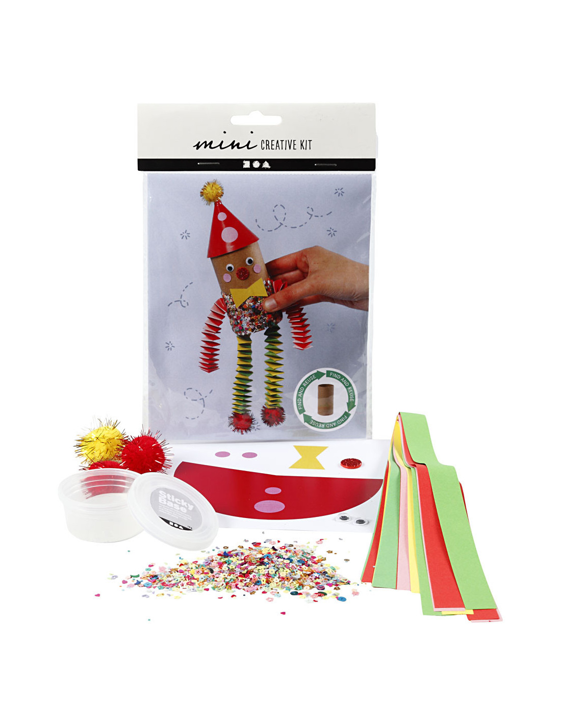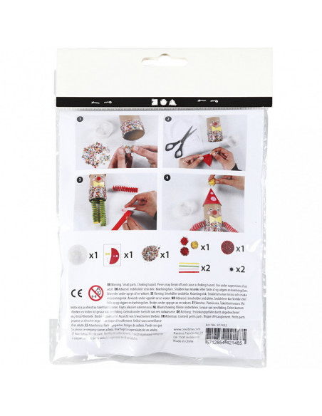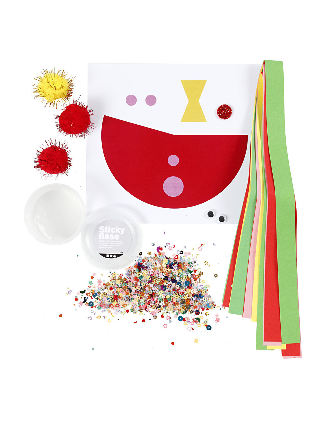 In het zakje zitten de meeste benodigdheden: papieren stroken, pailletten, pom-poms, Sticky Base, zelfklevende cirkels van EVA-foam en wiebelogen.