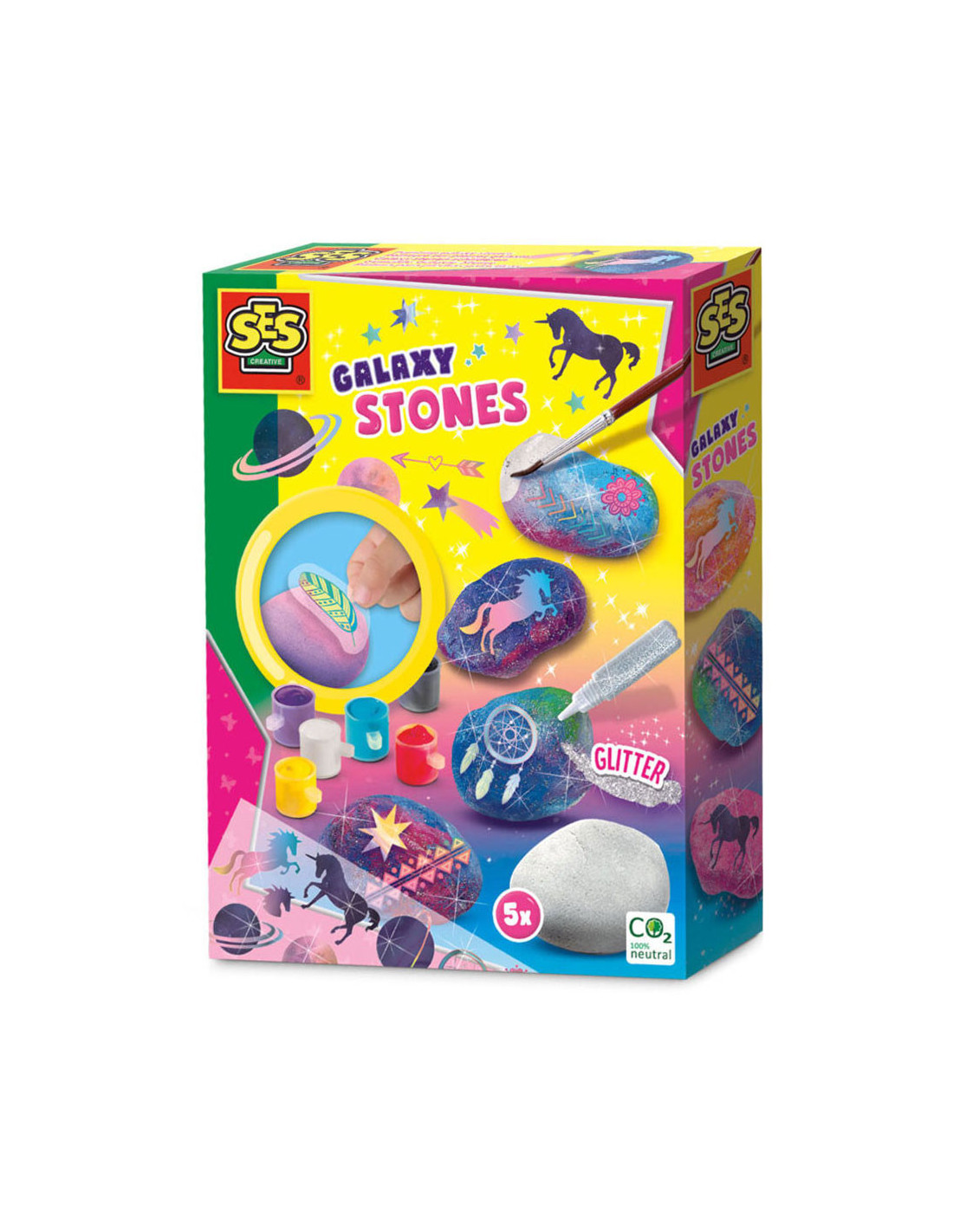 De stenen zijn met de toffe rub on stickers en verf om te toveren tot magische galaxy stenen. Kinderen kunnen de 5 stenen helemaal naar eigen creativiteit omtoveren en met de glitter worden de stenen helemaal afgemaakt.