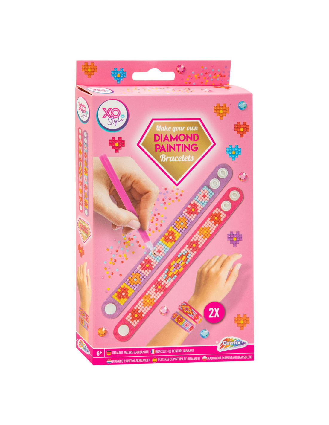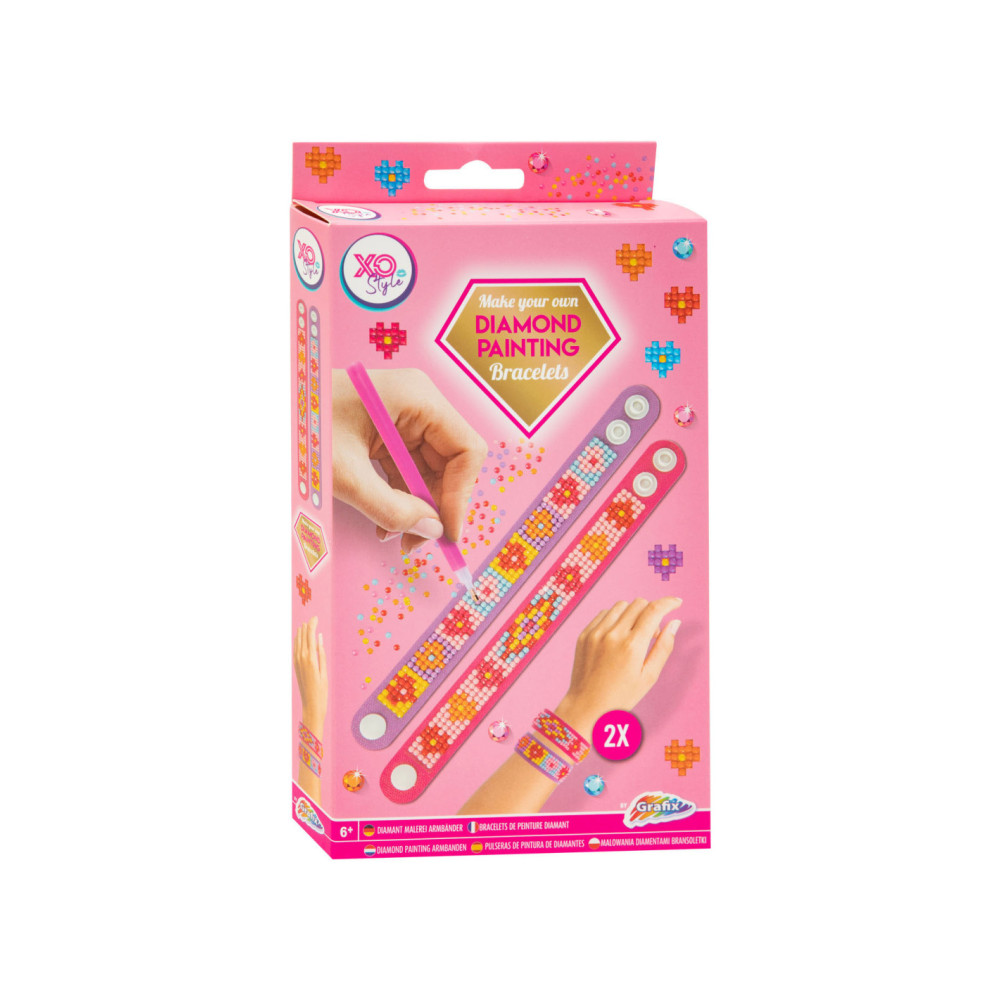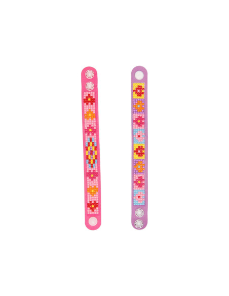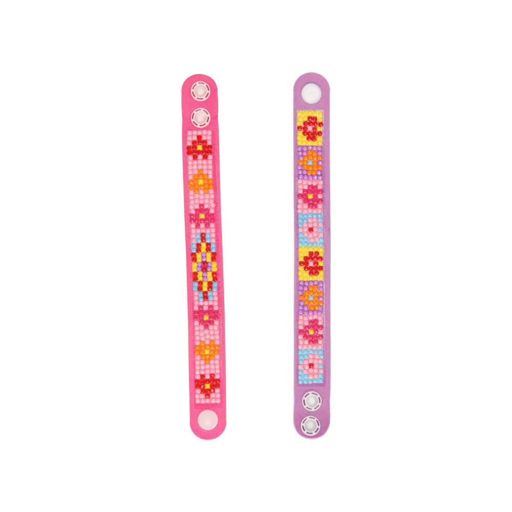 Knutselset voor het maken van 2 diamond painting armbandjes in roze/paars. Voor kinderen vanaf 6 jaar.