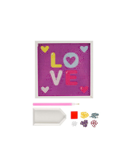 Diamond painting is een ontspannende en creatieve hobby waarbij je kleine harsdiamantjes, ook wel 'diamonds' genoemd, op een voorbedrukt canvas plaatst. De set bevat een gedetailleerd canvas met het ontwerp van de tekst 'LOVE', voorgevormde diamonds in verschillende kleuren, een speciale pen om de diamonds op te pakken en op het canvas te plaatsen, een waxblokje om de pen te prepareren, en een handig lijstje van 15 x 15 centimeter om je voltooide kunstwerk in te presenteren.