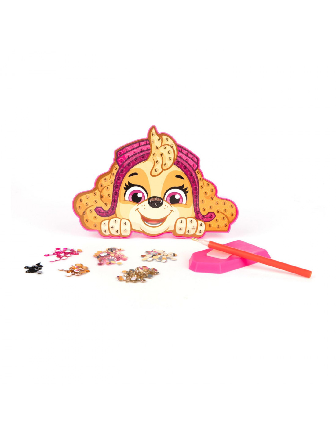 Diamond painting knutselsetje met figuur van PAW Patrol karakter Skye. Inclusief Skye-figuur, applicator pen, bakje, verschillende kleuren steentjes, instructies en lijmblokje. Niet geschikt voor kinderen onder de 3 jaar oud.