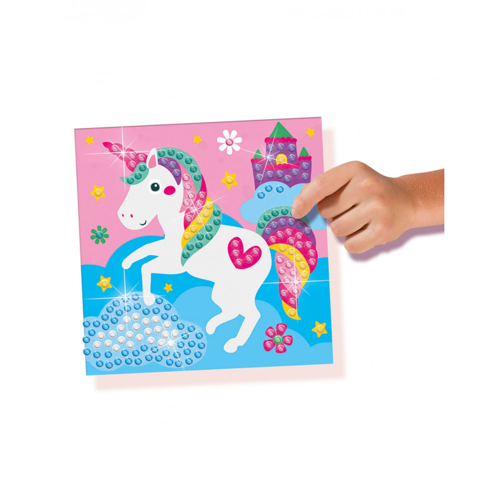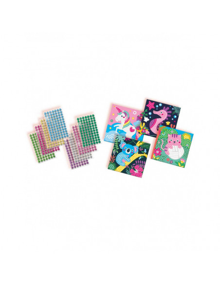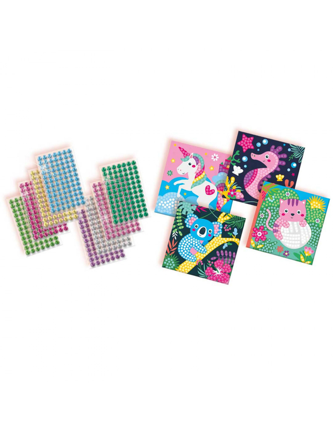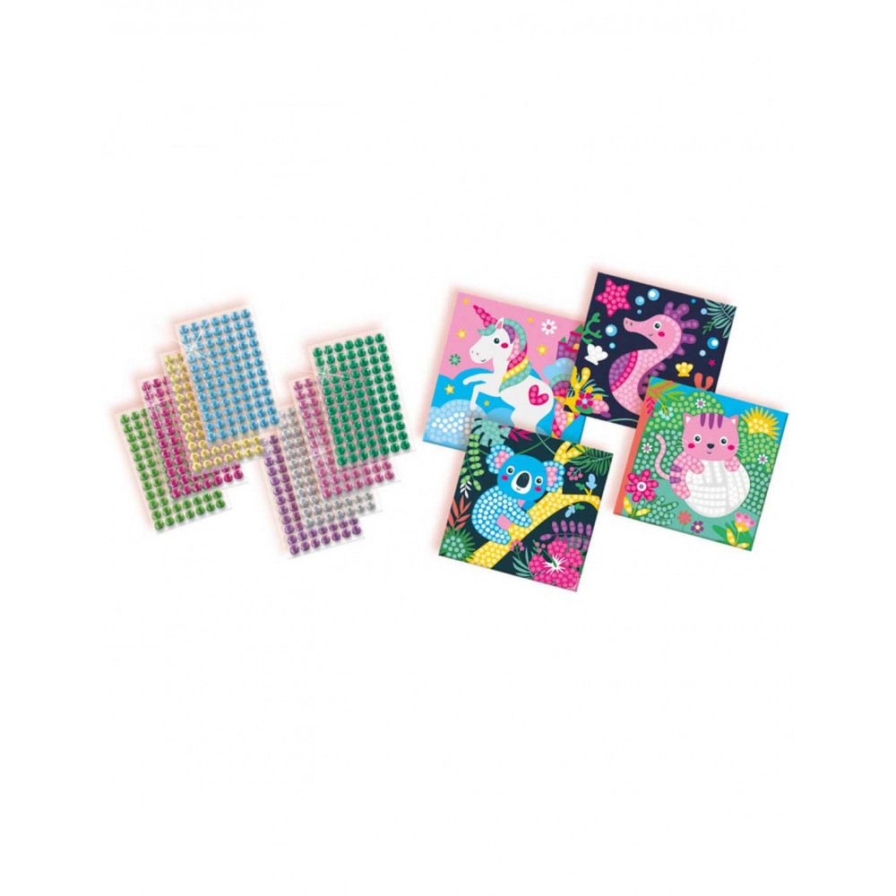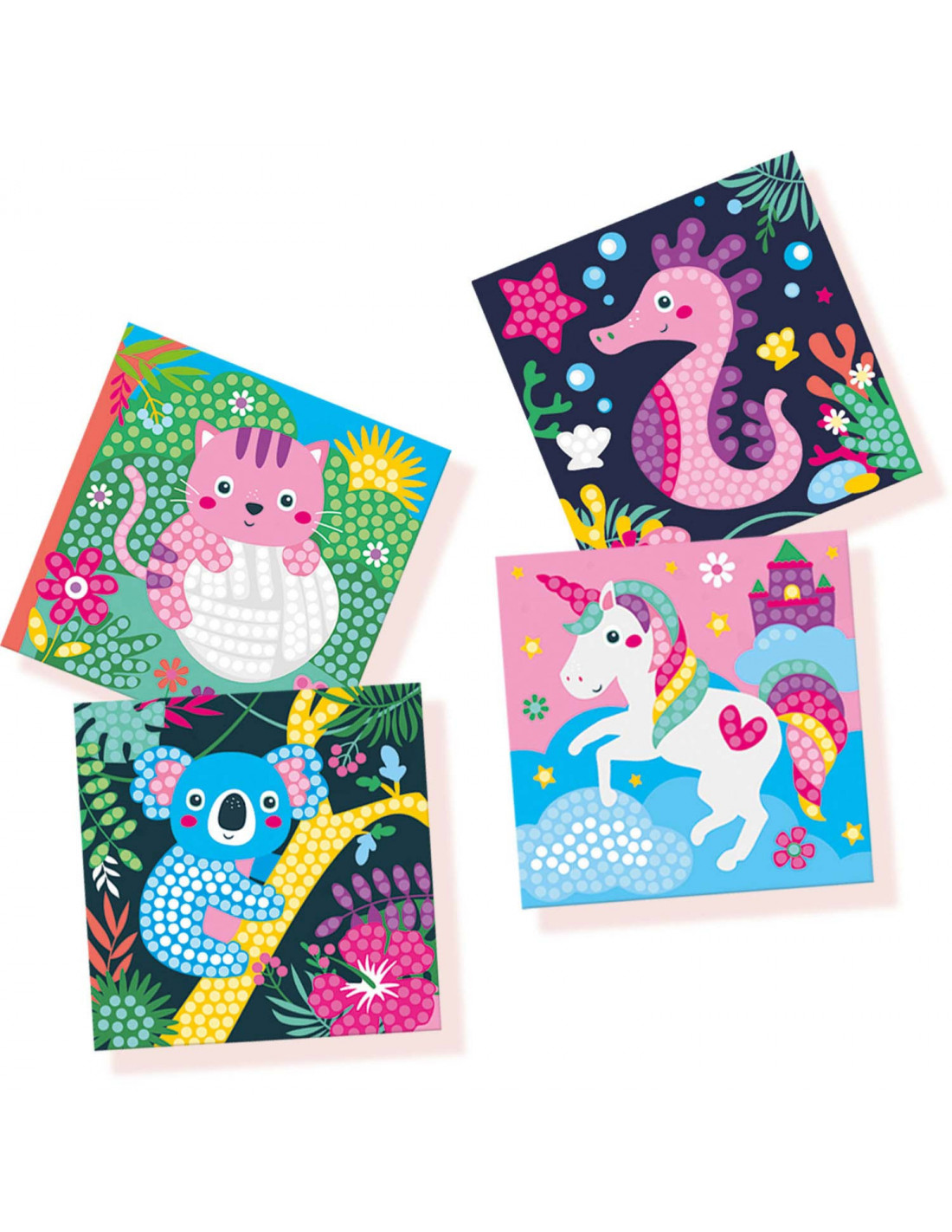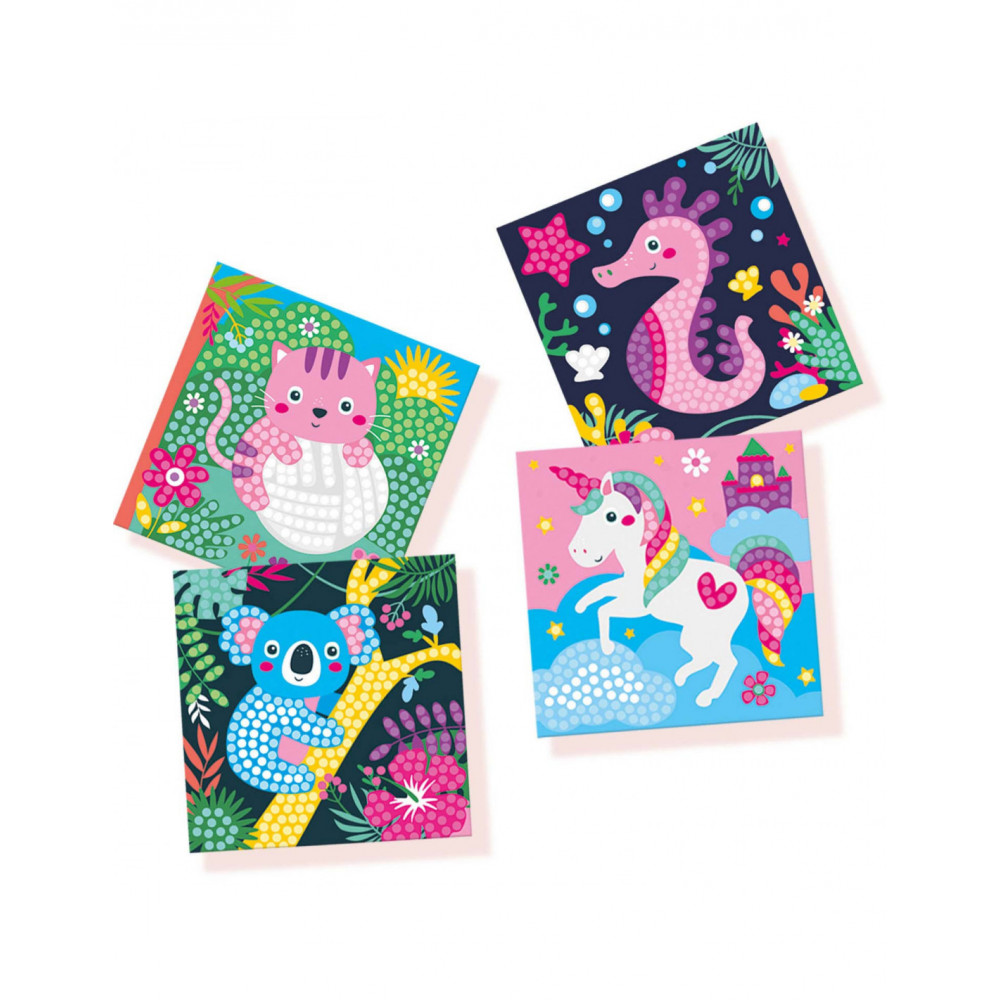 Met deze grote Diamond painting kaarten met extra veel diamant steentjes ben je wel even druk. De glimmende diamantstippen zijn zelfklevend, en daarmee dus heel eenvoudig te plakken op de vrolijke kaarten. Versier de unicorn, kat, koala en het zeepaardje.