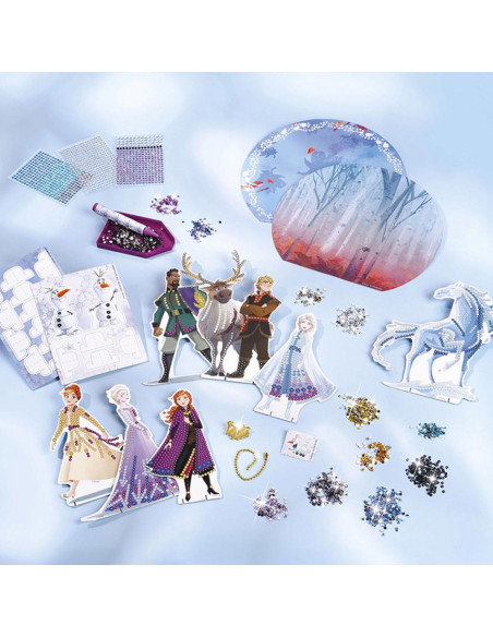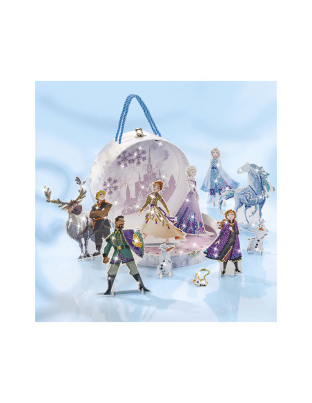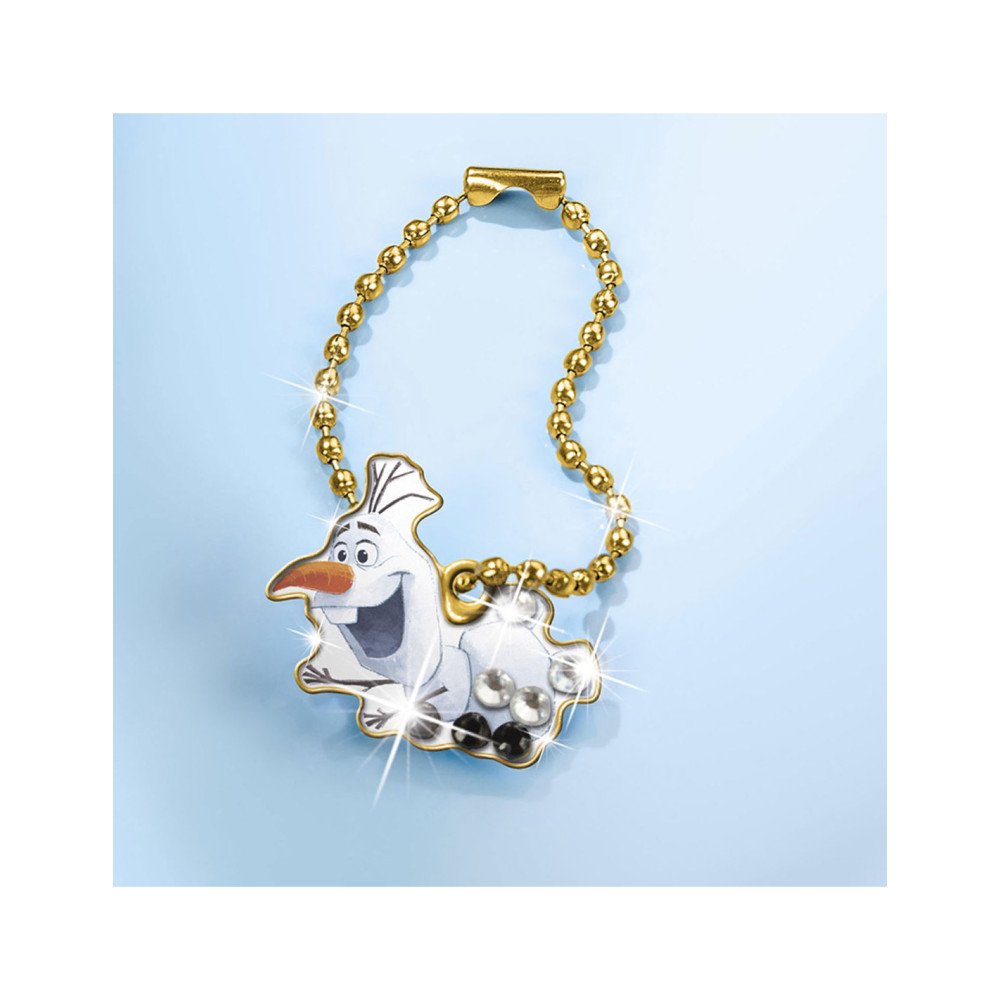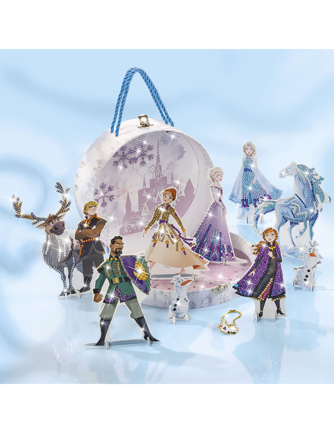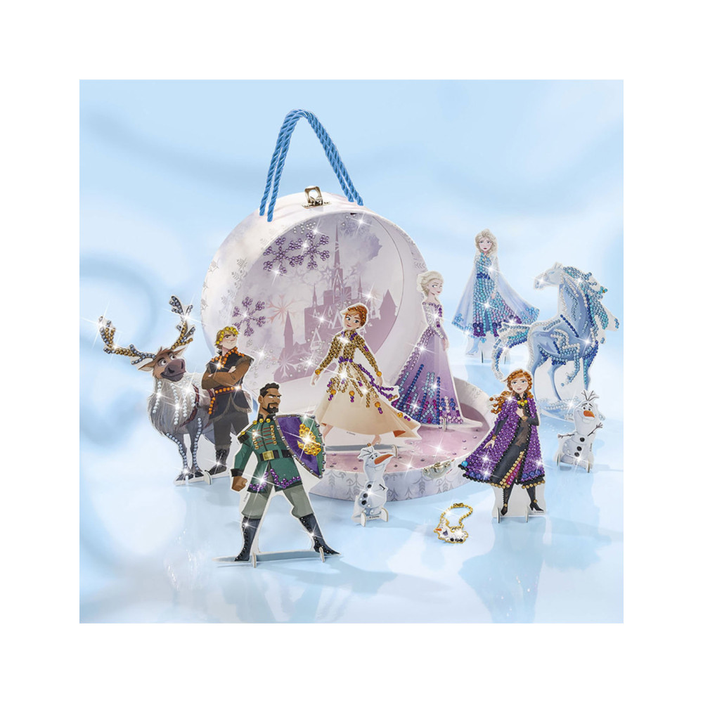 Versier Frozen kaarten met strassteentjes. Er zijn 9 kartonnen figuren die jij helemaal kan versieren met meer dan 3000 strassteentjes. Het koffertje is ideaal om mee te nemen welke je ook nog eens kan omtoveren in een Frozen speelachtergrond. Veel speelplezier! In de koffer zit een goudkleurige Olaf tashanger die je bijvoorbeeld aan je koffer kan hangen.