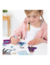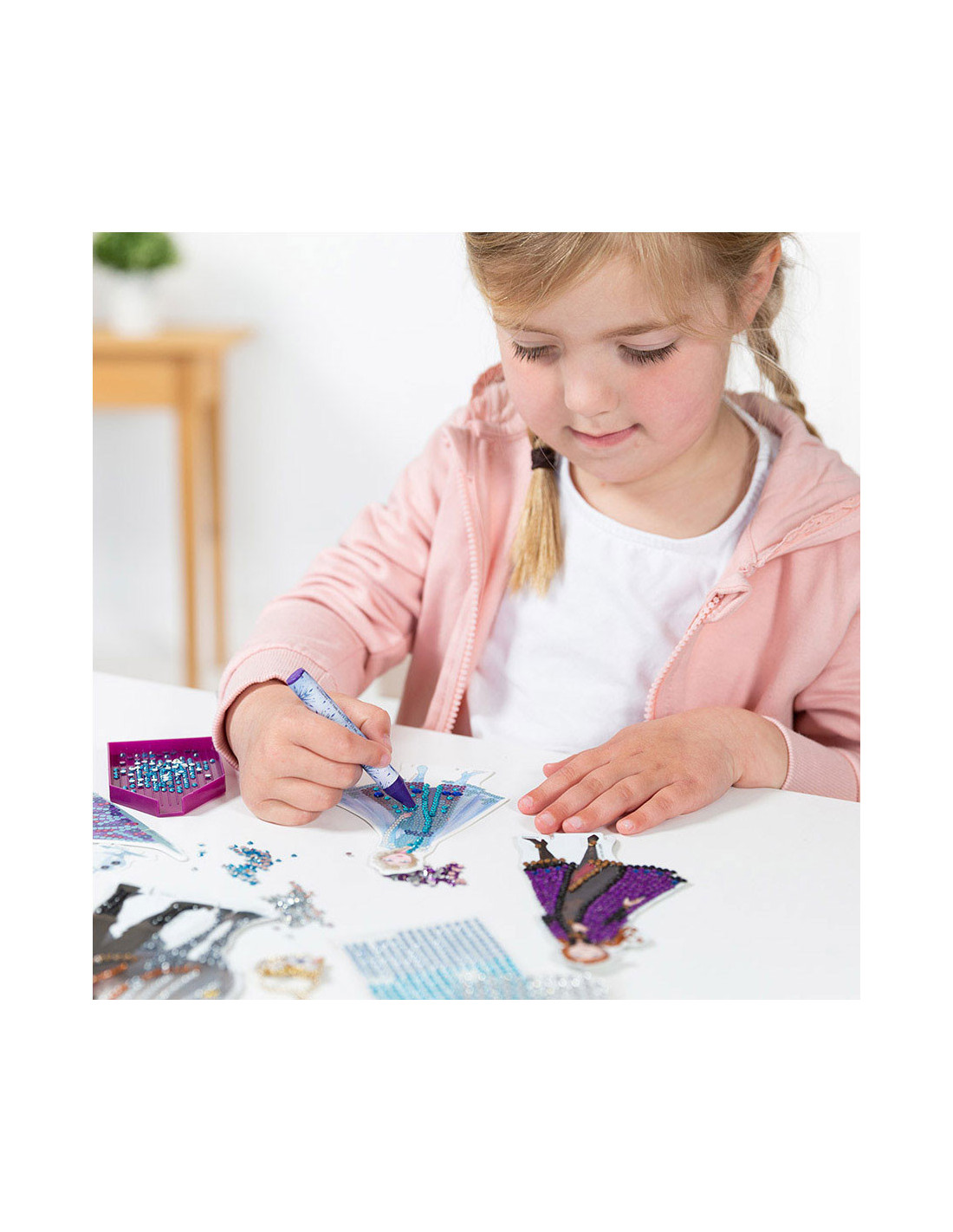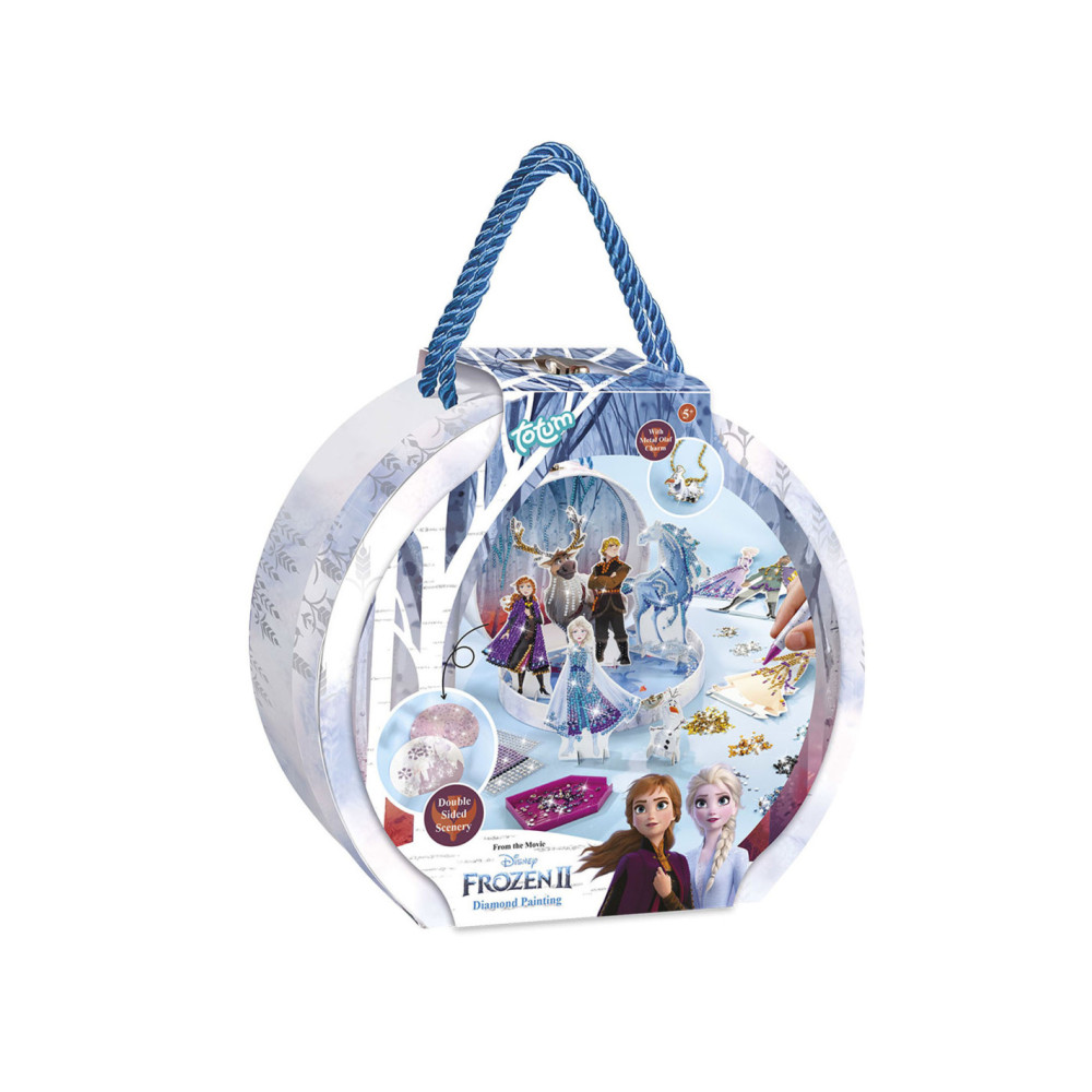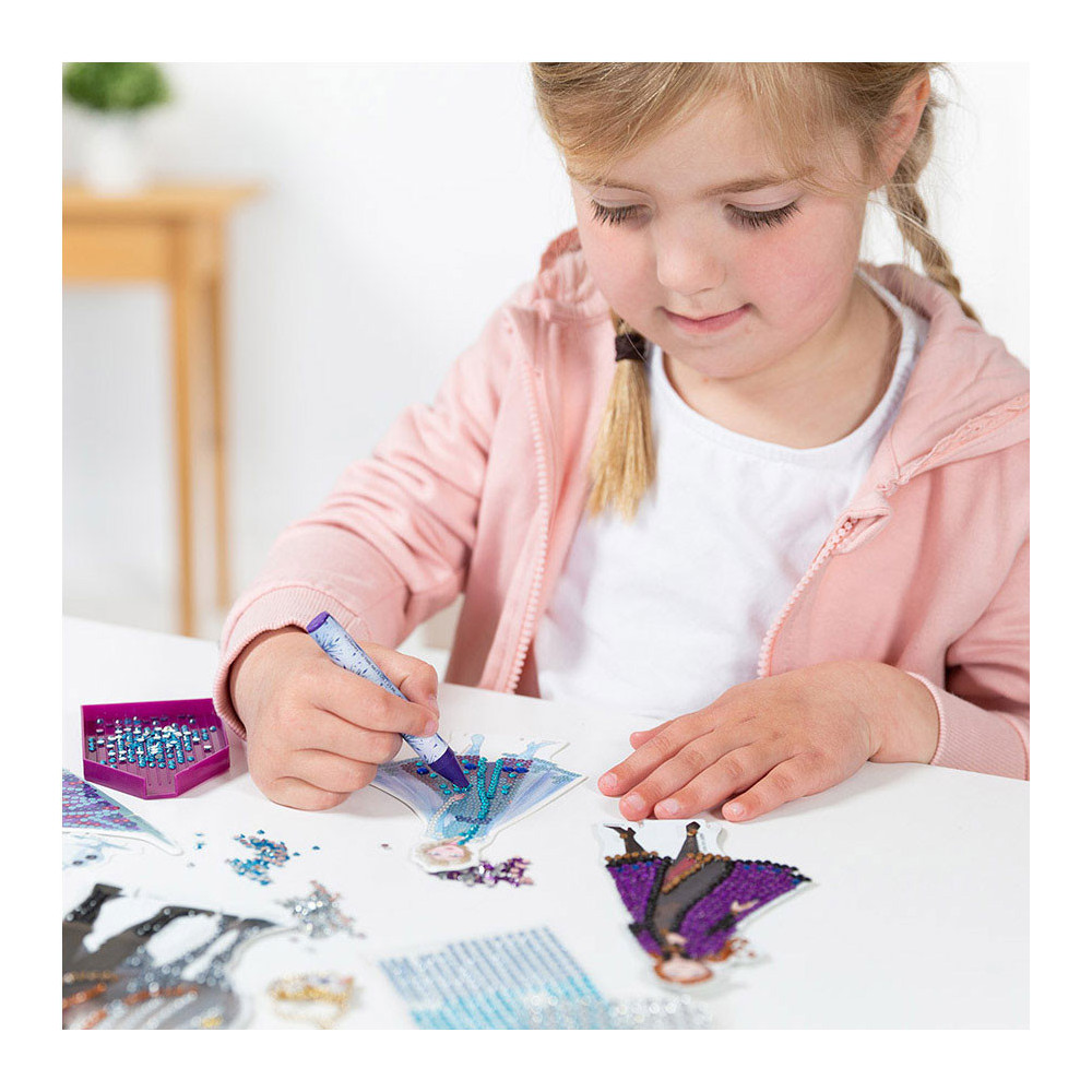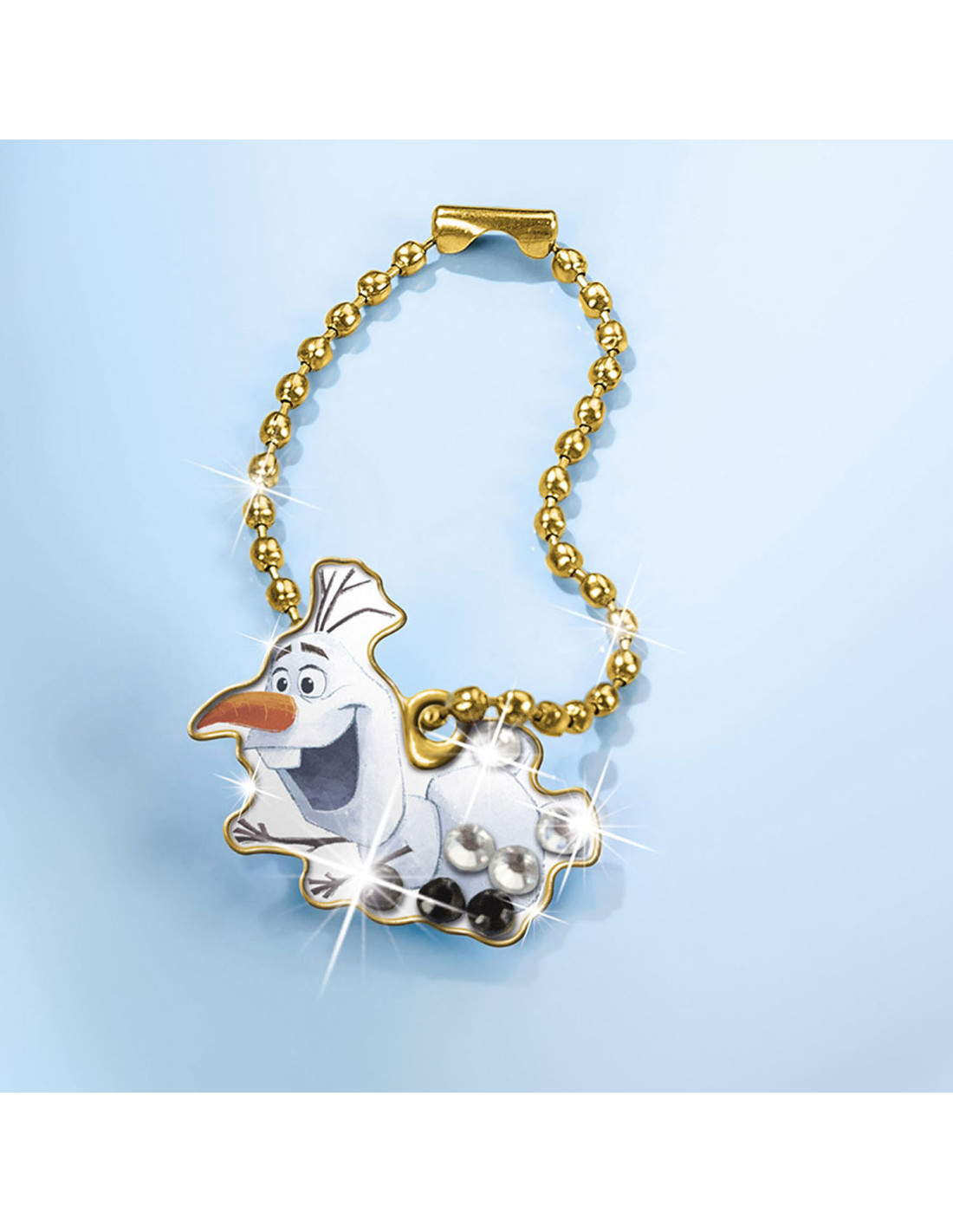 Versier Frozen kaarten met strassteentjes. Er zijn 9 kartonnen figuren die jij helemaal kan versieren met meer dan 3000 strassteentjes. Het koffertje is ideaal om mee te nemen welke je ook nog eens kan omtoveren in een Frozen speelachtergrond. Veel speelplezier! In de koffer zit een goudkleurige Olaf tashanger die je bijvoorbeeld aan je koffer kan hangen.