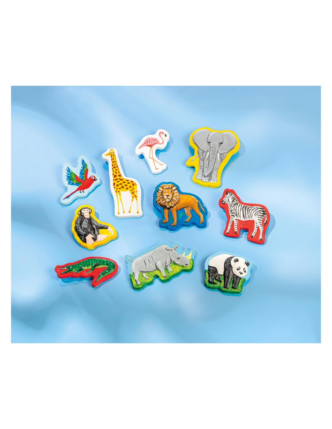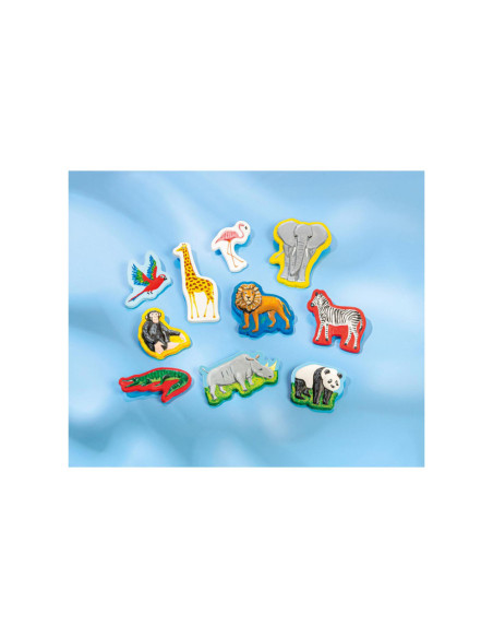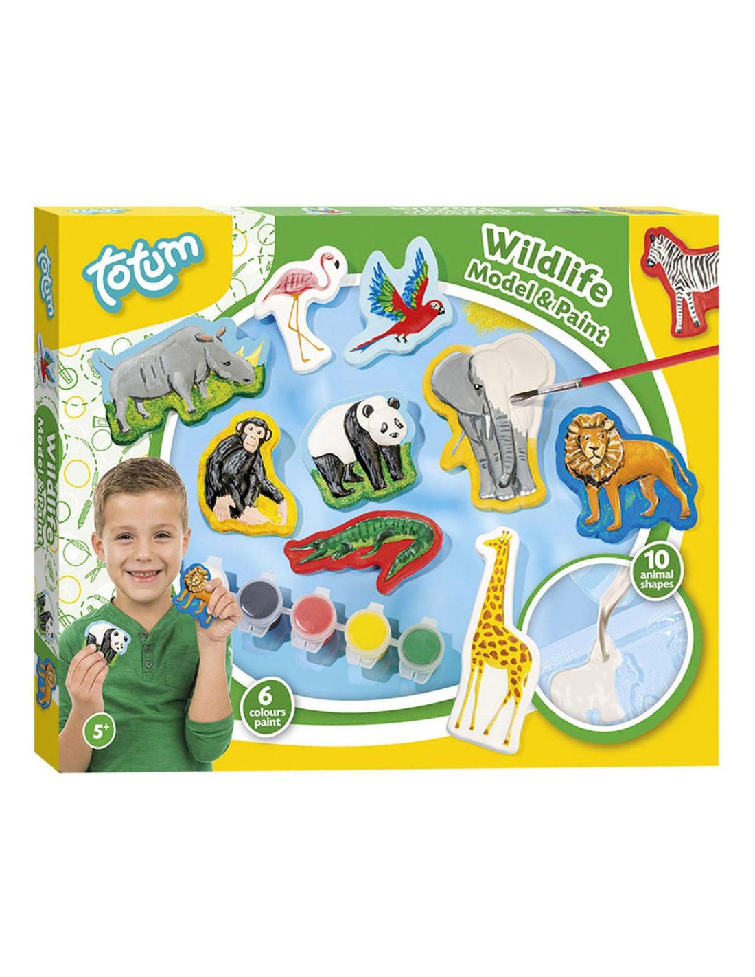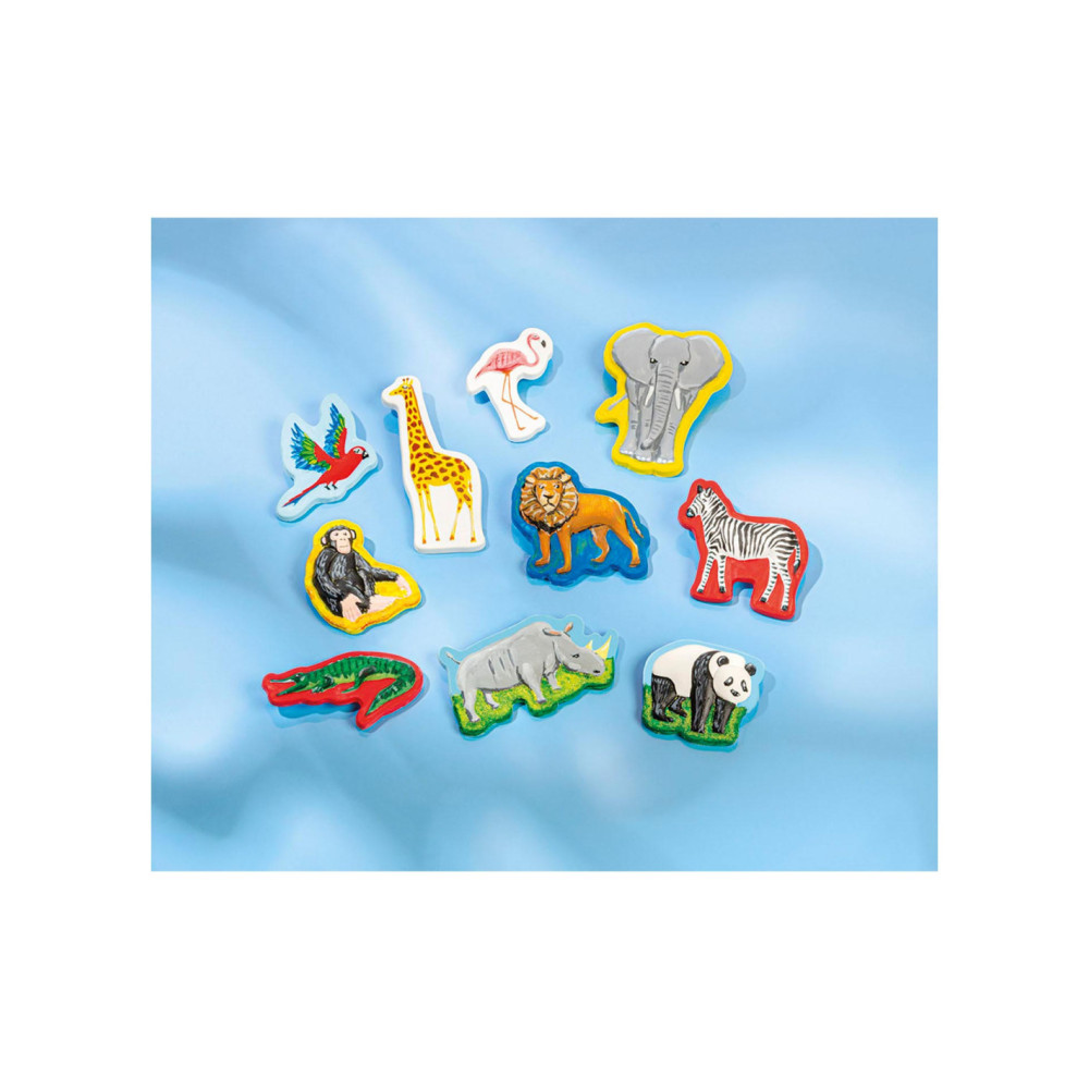 Knutselset van Totum waarmee je 10 wilde dieren van gips maakt en beschildert: aap, flamingo, giraffe, krokodil, leeuw, olifant, neushoorn, papegaai en zebra. Inclusief 6 potjes verf en een penseel. Geschikt voor kinderen vanaf 5 jaar oud.