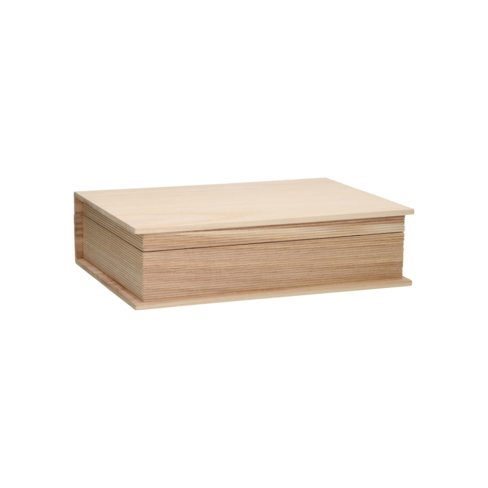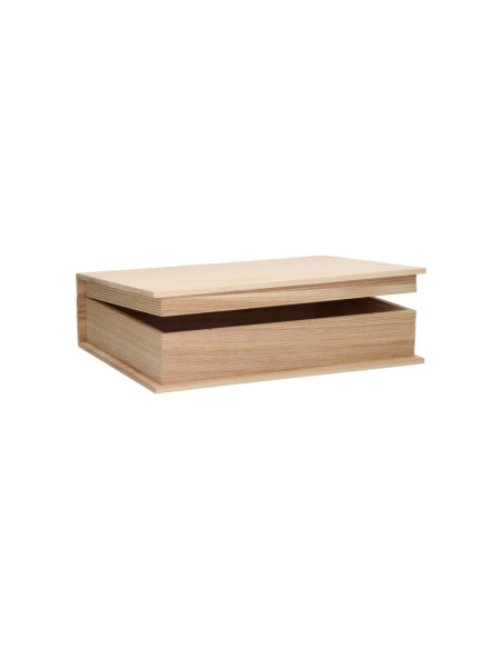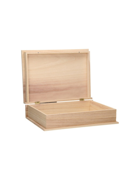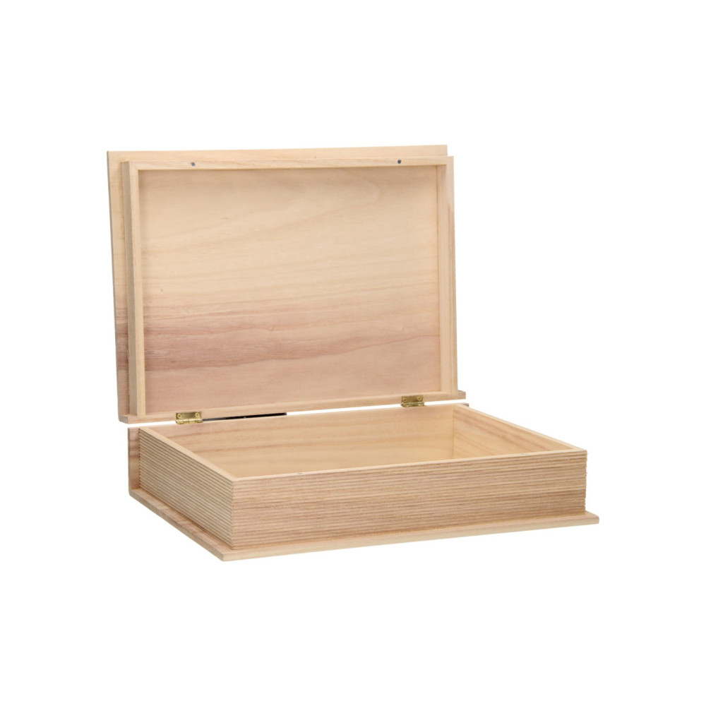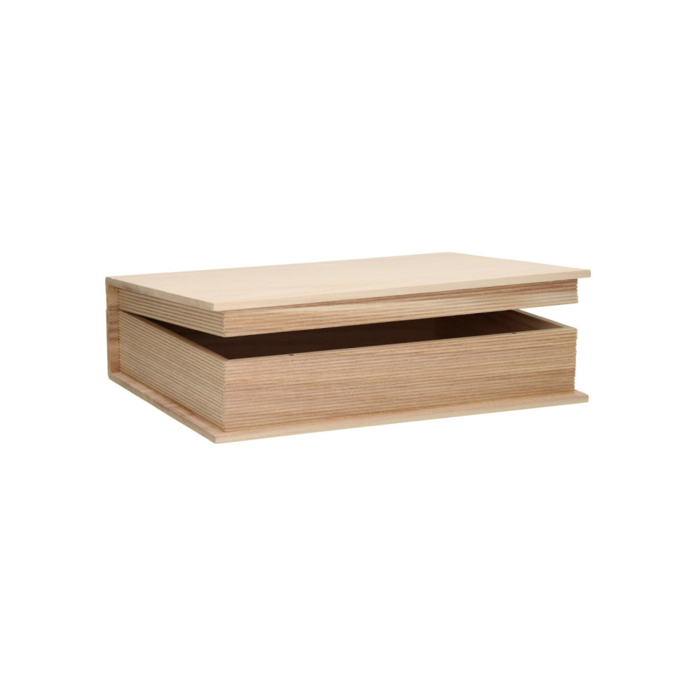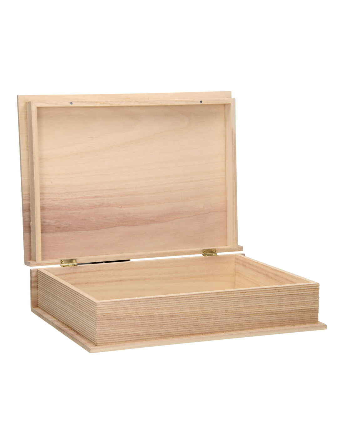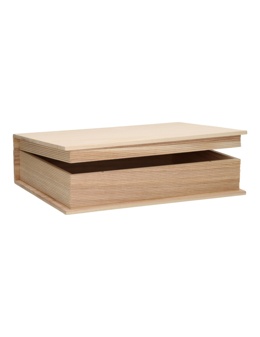 Grote opbergkist in de vorm van een boek. De kist is gemaakt van grenen hout en heeft een klepdeksel. De scharnieren hebben een gouden kleur. Afmeting binnenkant: 32 x 22,7 centimeter. Versier de opbergkist naar eigen wens.