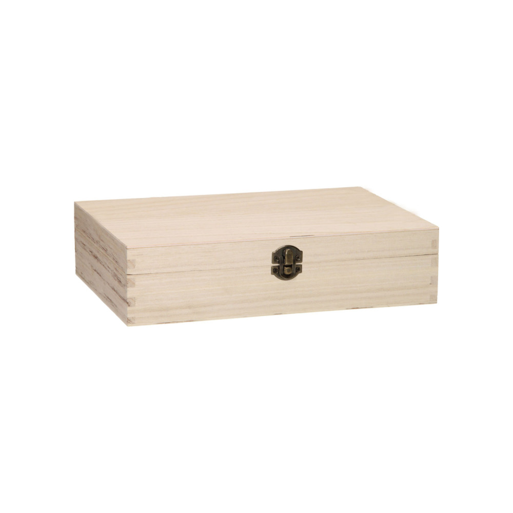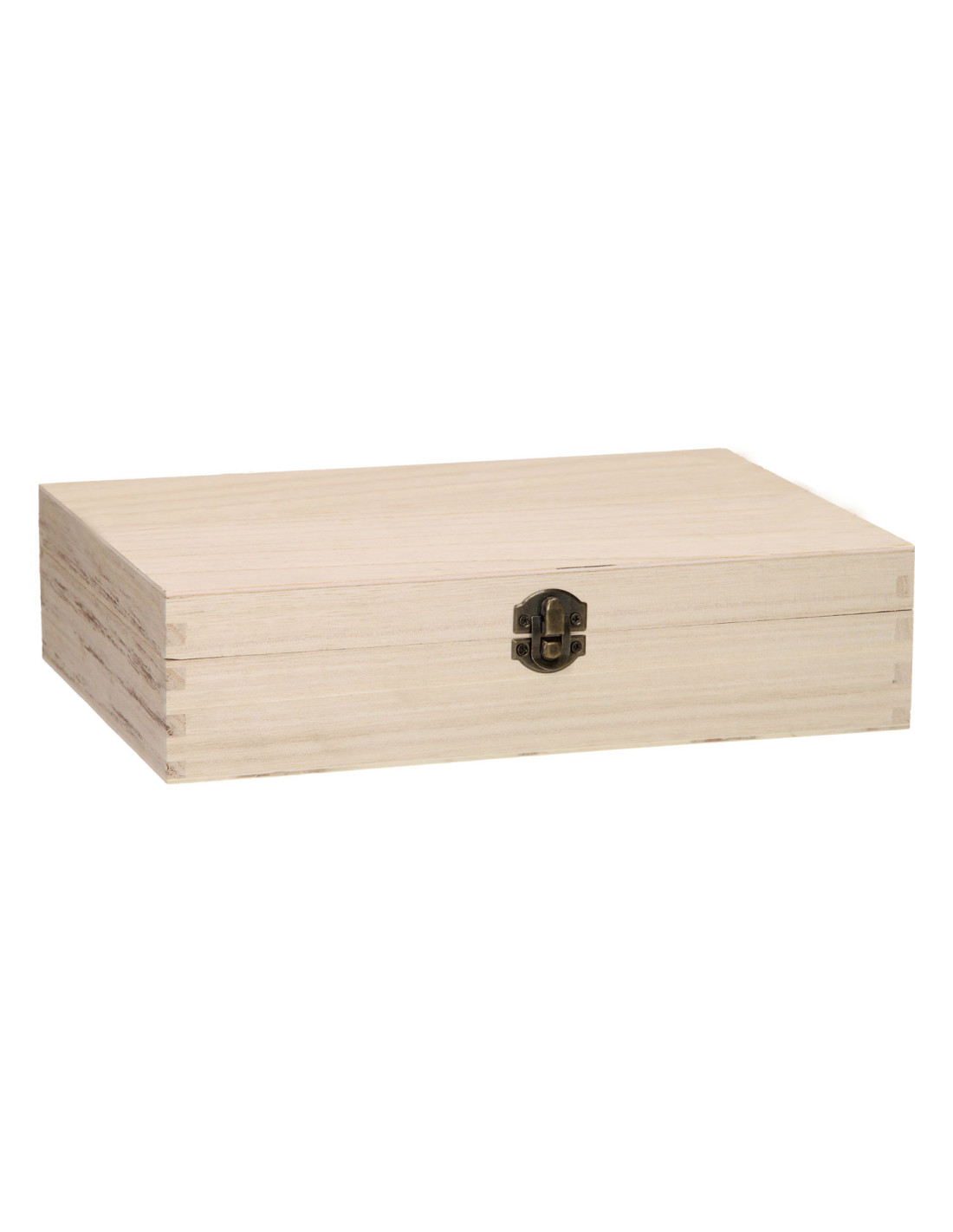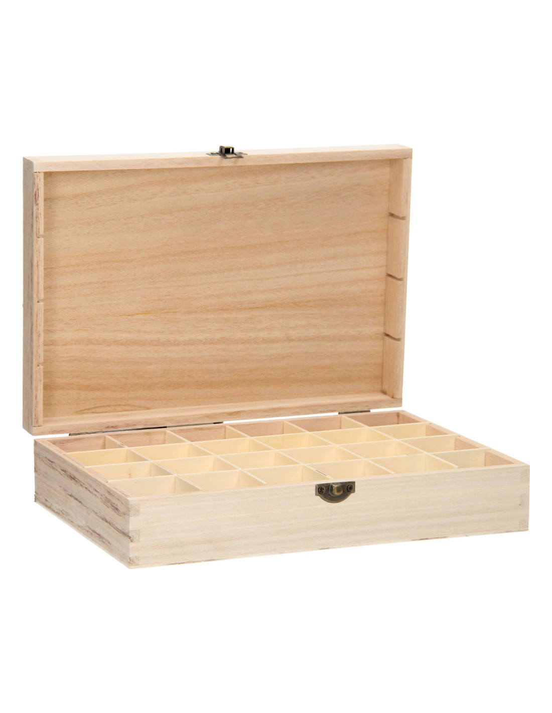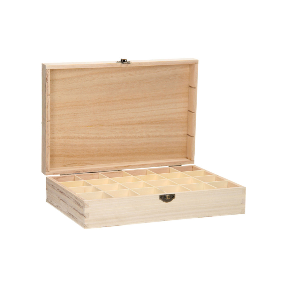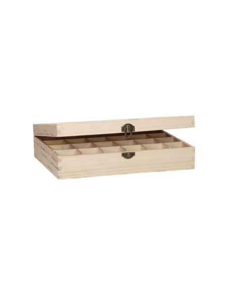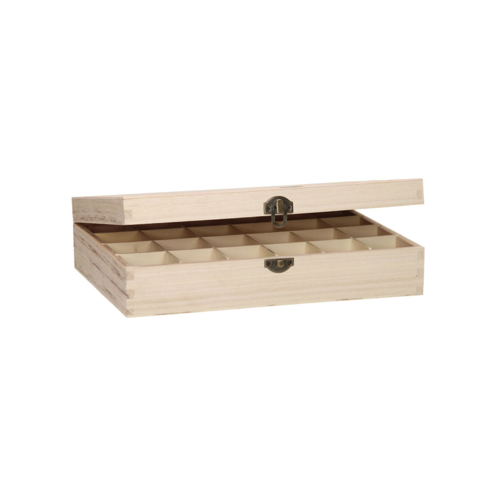 Rechthoekige kist van grenen hout met klepdeksel. De klepdeksel heeft een bronzen kliksluiting. De kist heeft 24 vakjes. De afmeting van een vakje is 4,2 bij 4,2 centimeter. Kleur scharnieren: brons. Versier naar eigen wens.