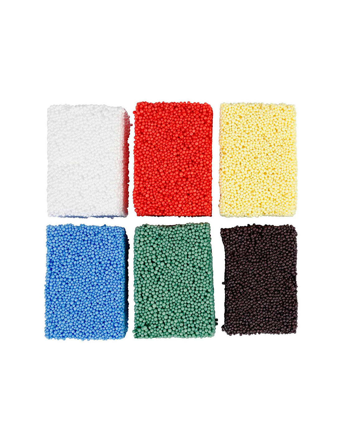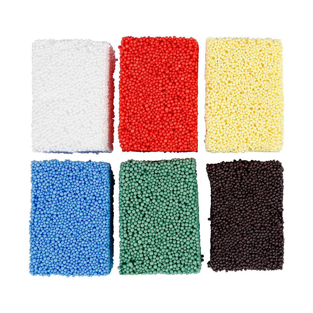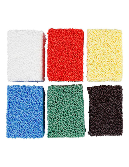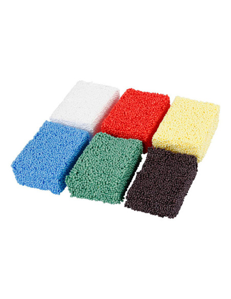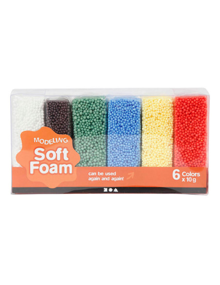 Zacht en lichtgewicht boetseerklei met een stevige consistentie van styropor balletjes. Droogt niet aan de lucht en kan keer op keer gebruikt worden. Inhoud: 6 potjes van 10 gram elk, in de kleuren wit, rood, geel, blauw, groen en zwart.