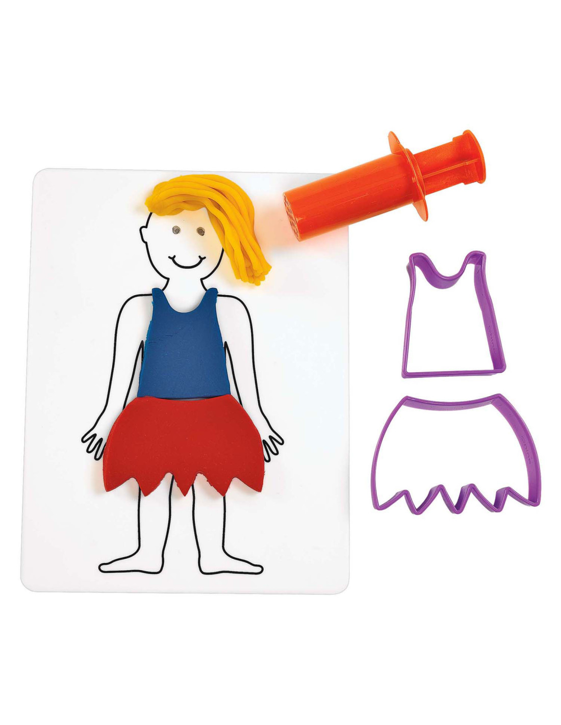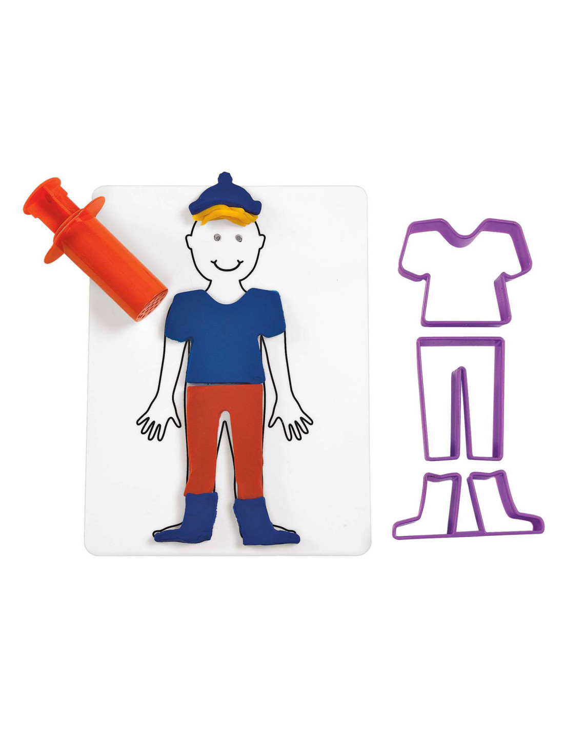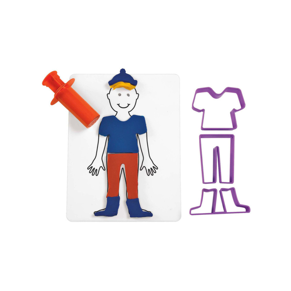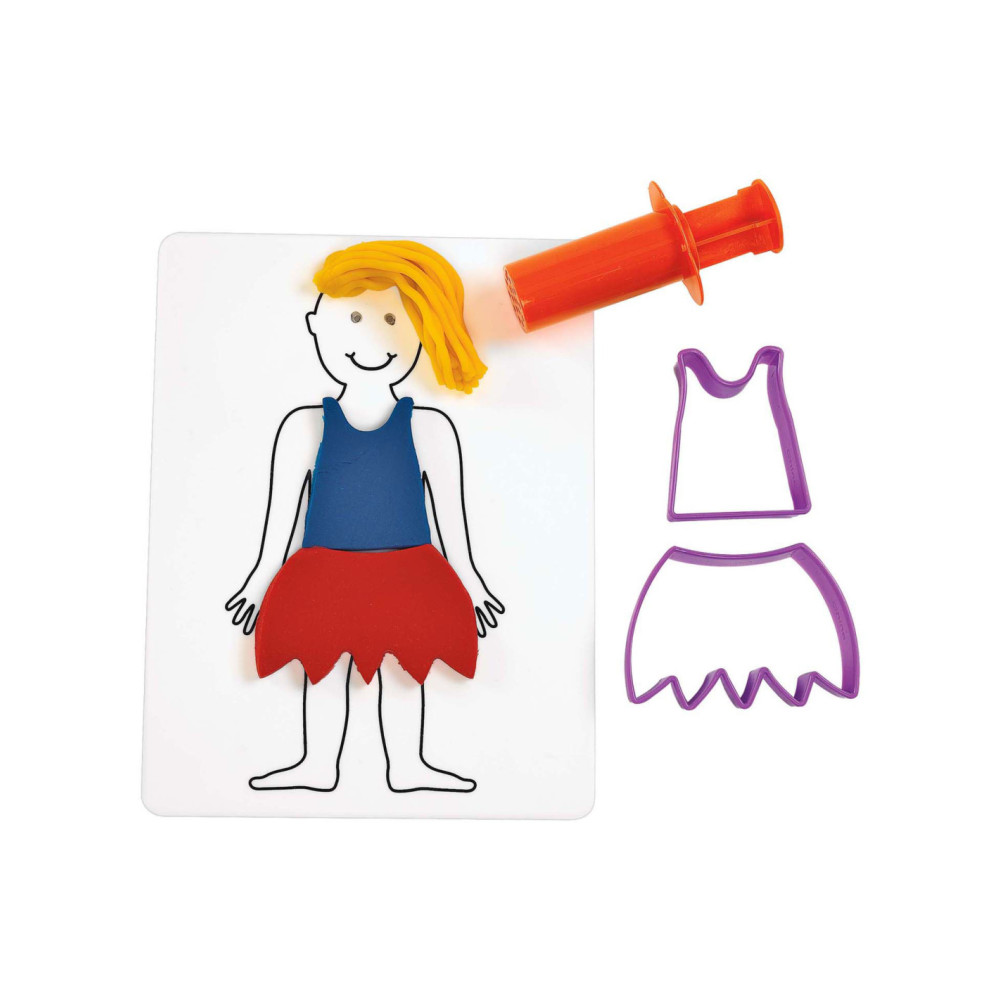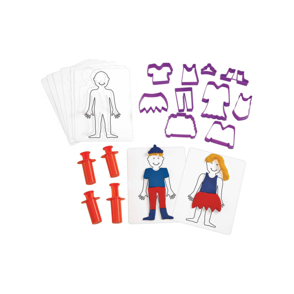 Kleed je eigen persoonlijke vriend aan! Kleed de figuren aan op de stevige plastic speelmatten met figuurtjes. Met 10 kledinguitstekers en 4 kleipersen kan je kind urenlang plezier beleven met sensorisch klei! (Klei niet inbegrepen).