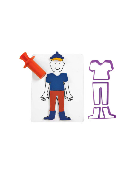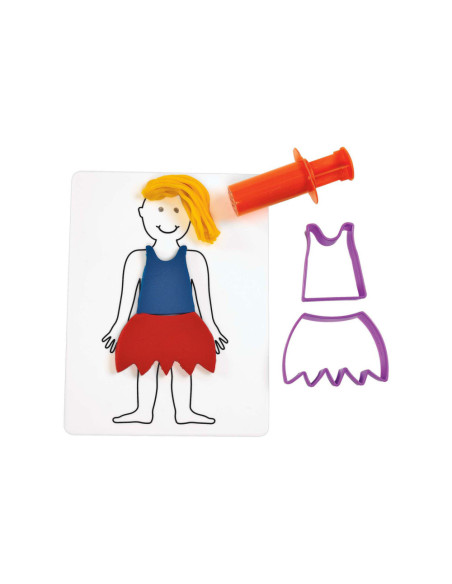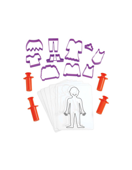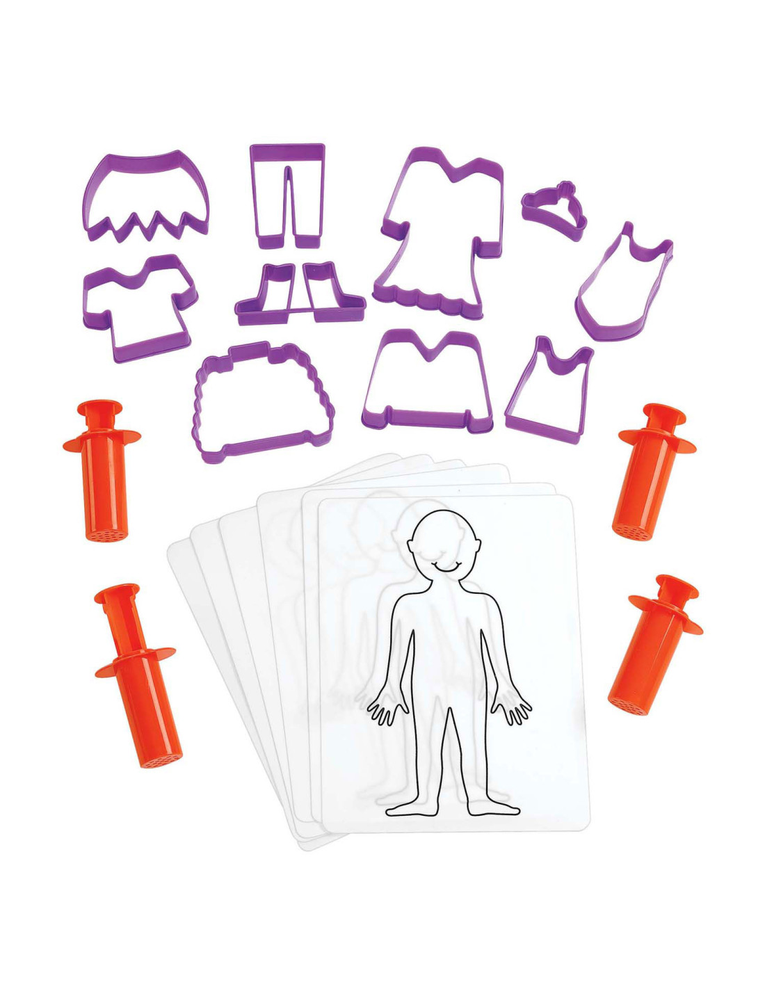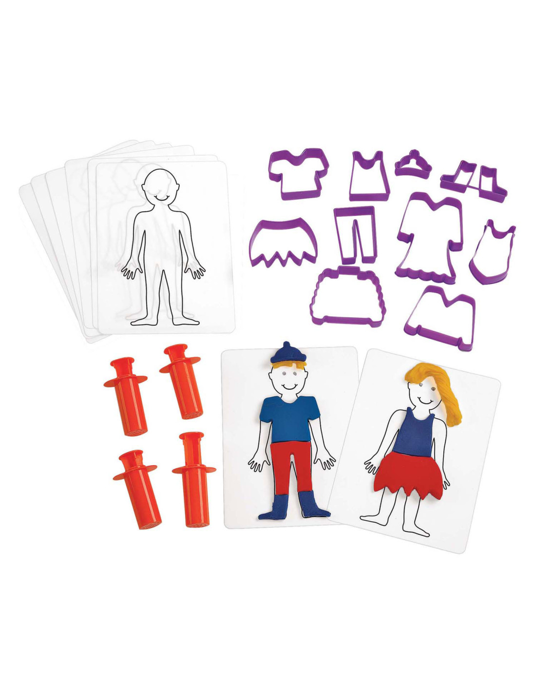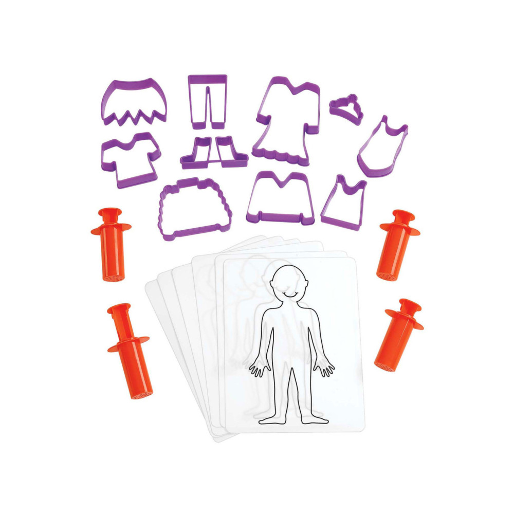 Kleed je eigen persoonlijke vriend aan! Kleed de figuren aan op de stevige plastic speelmatten met figuurtjes. Met 10 kledinguitstekers en 4 kleipersen kan je kind urenlang plezier beleven met sensorisch klei! (Klei niet inbegrepen).