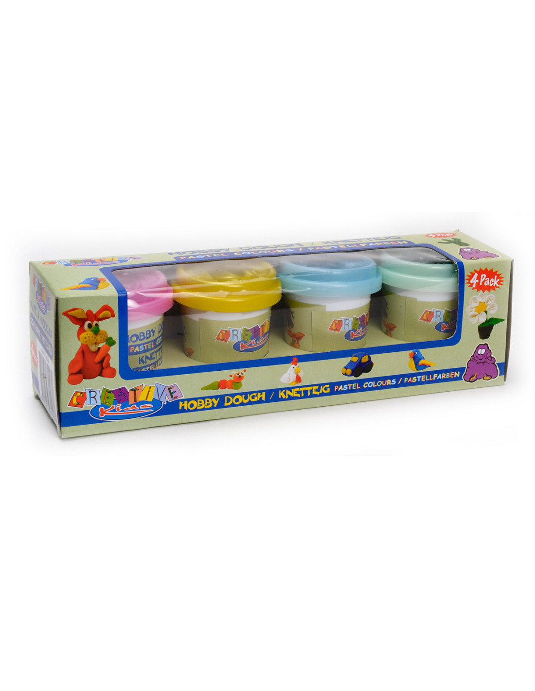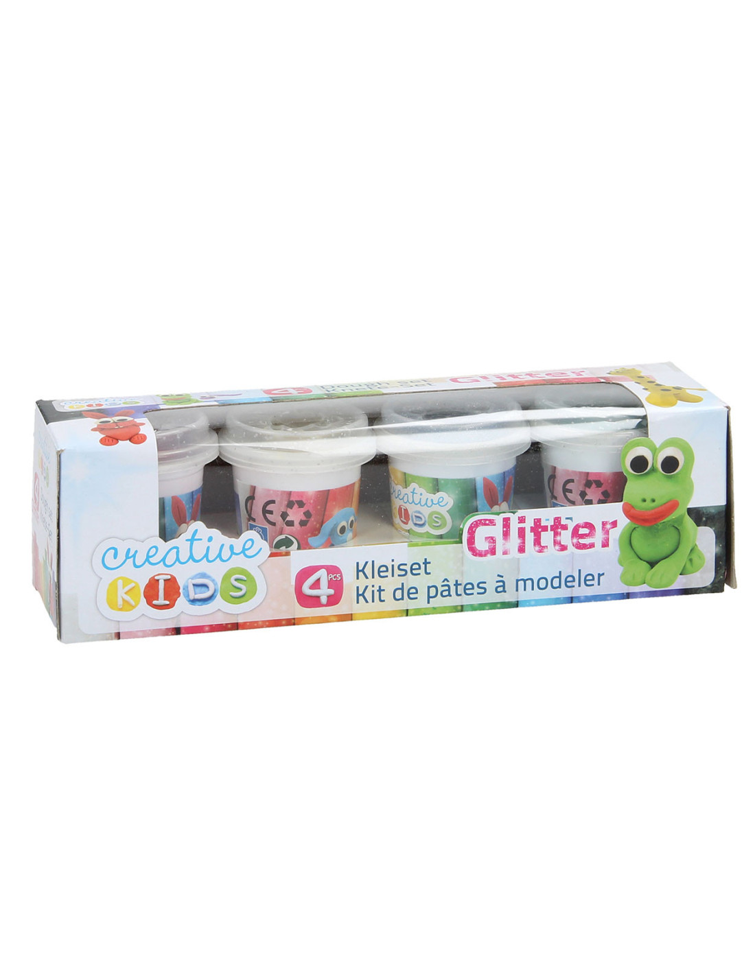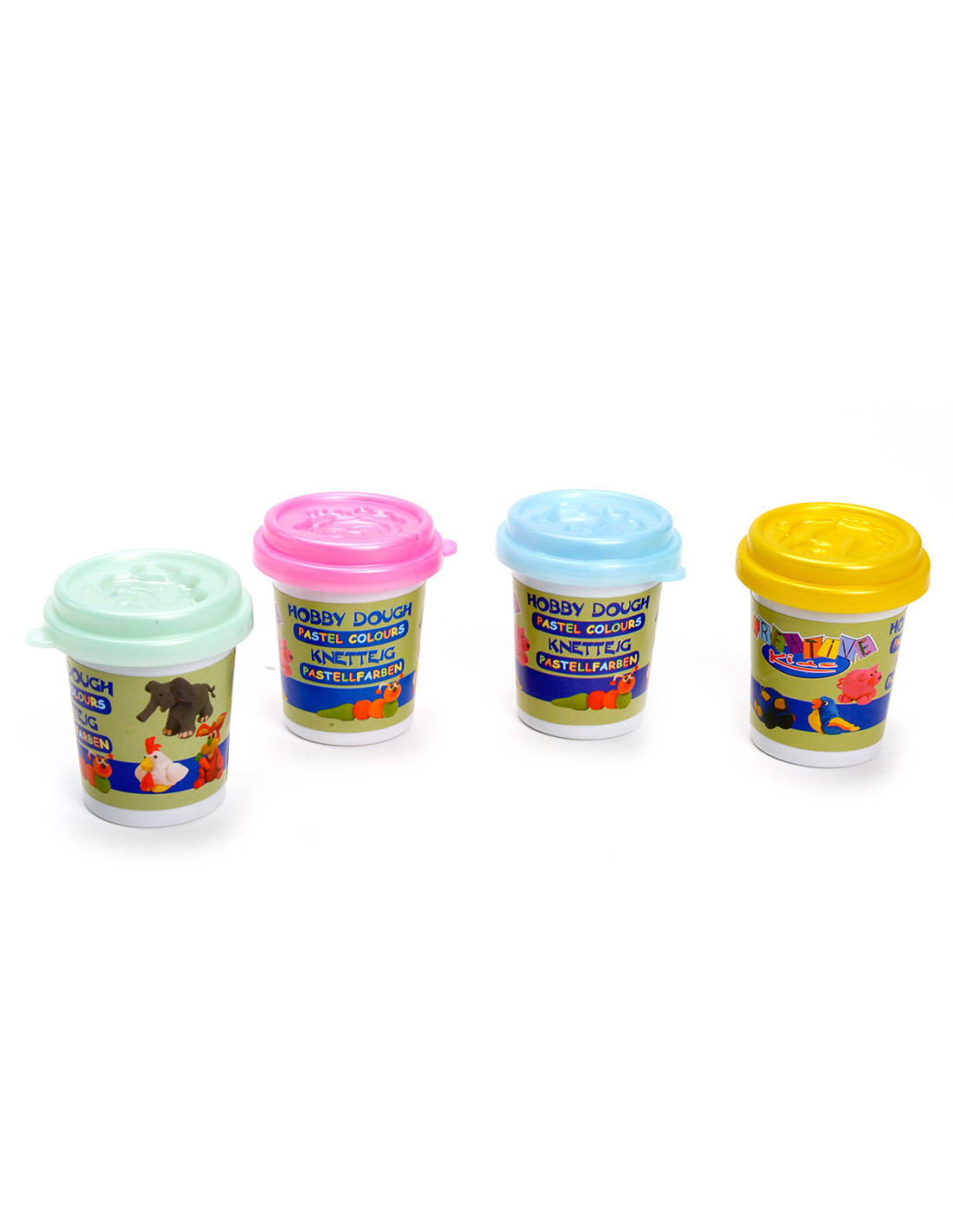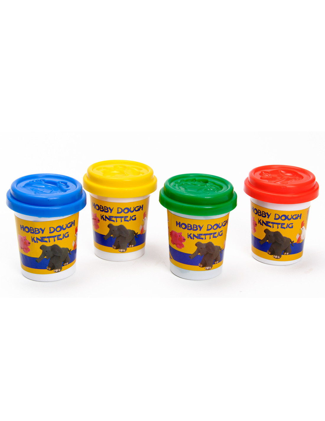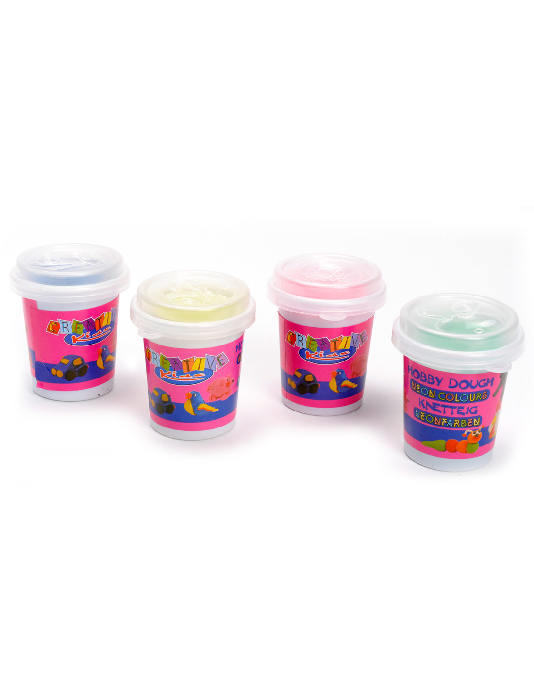 4 potjes klei in verschillende kleuren.