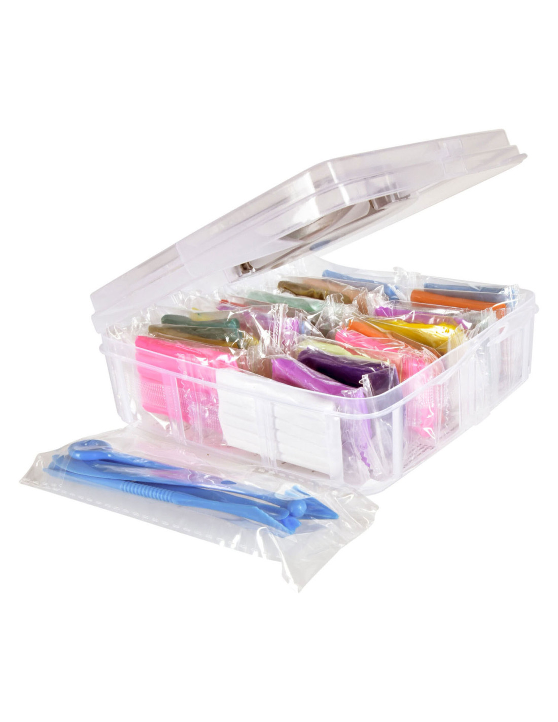 Set met 26 stuks polymeerklei en 5 gereedschappen in een handige opbergkoffer van kunststof. Klei elk apart verpakt.