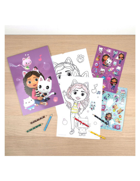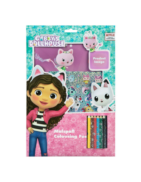 Gabby's Poppenhuis kleurboek met 6 kleurpotloden. Wees altijd Ready to Go met deze kleurset in de vorm van een boekje met harde kaft, met 30 kleurplaten, 6 verschillende kleurpotloden en een stickervel!