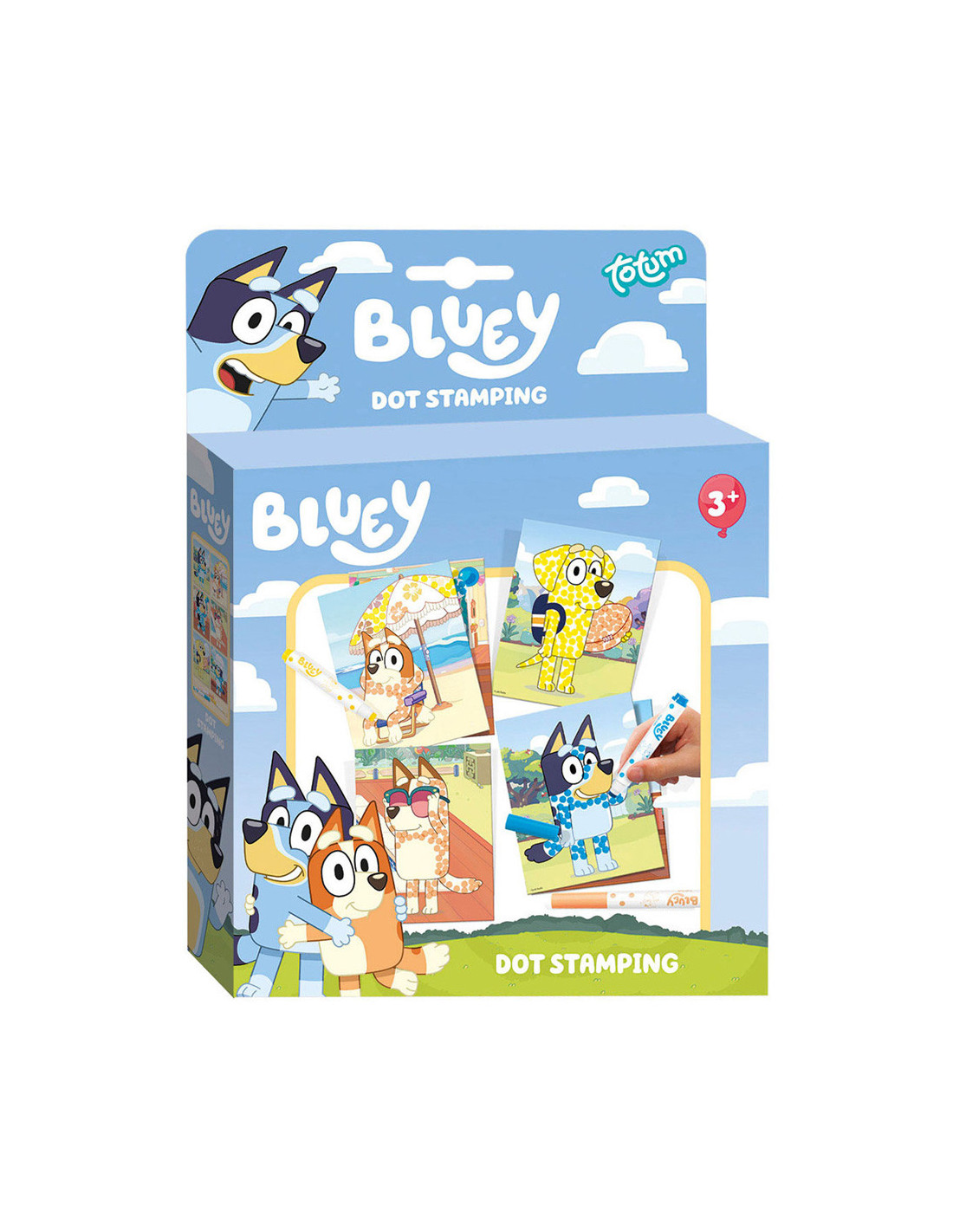 Bluey stippenkunst knutselsetje met 6 Bluey-kleurvellen en 3 stempelstiften met ronde, platte punt. Geschikt voor kinderen vanaf 3 jaar oud.