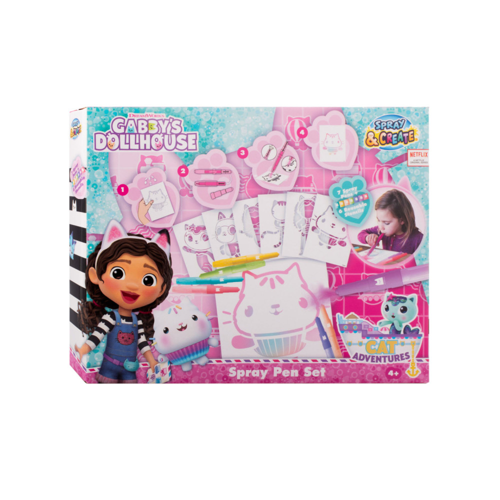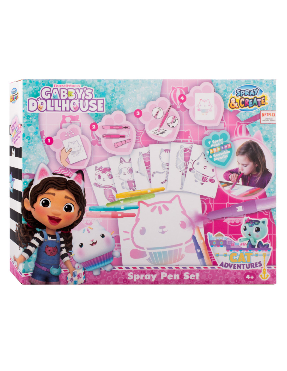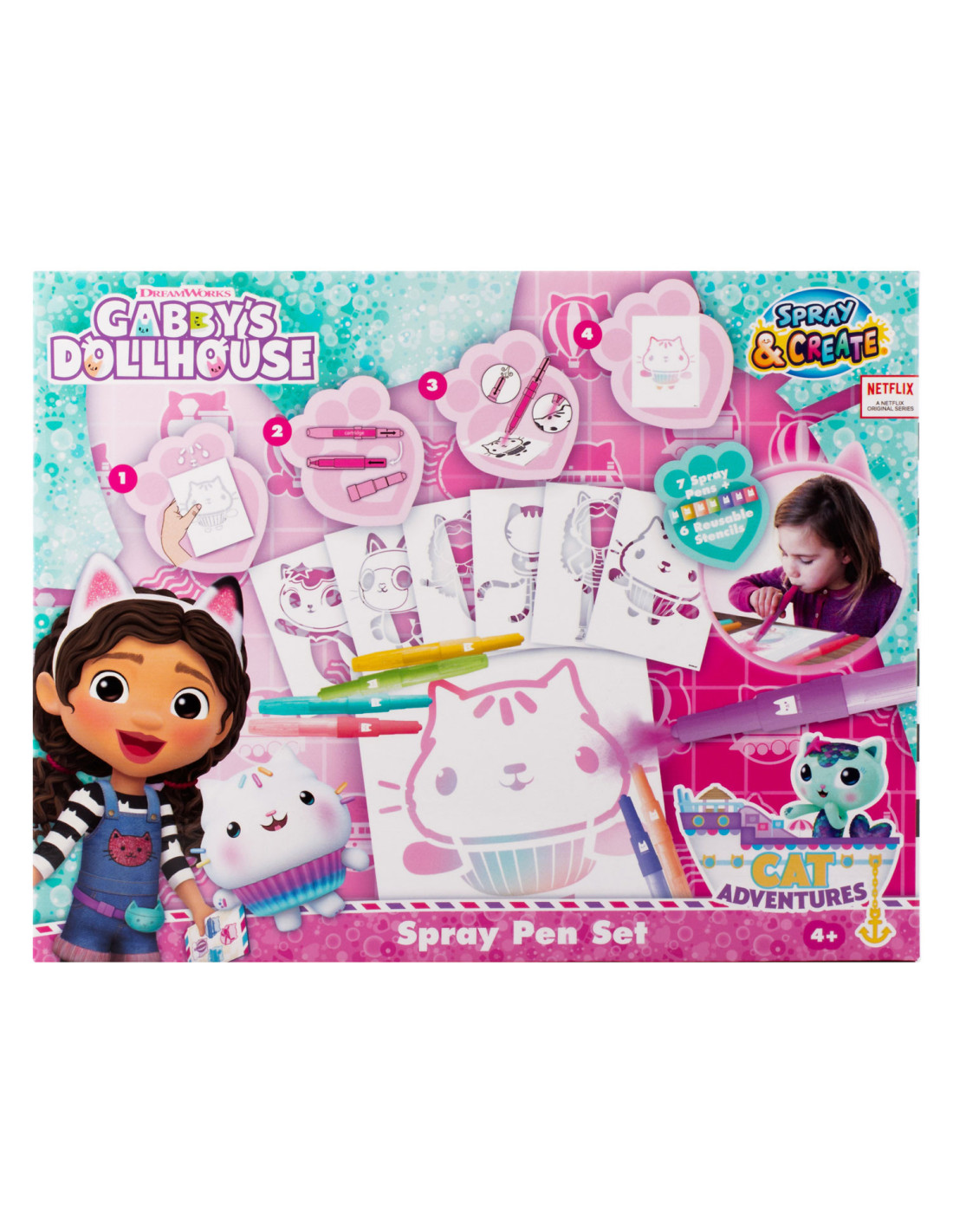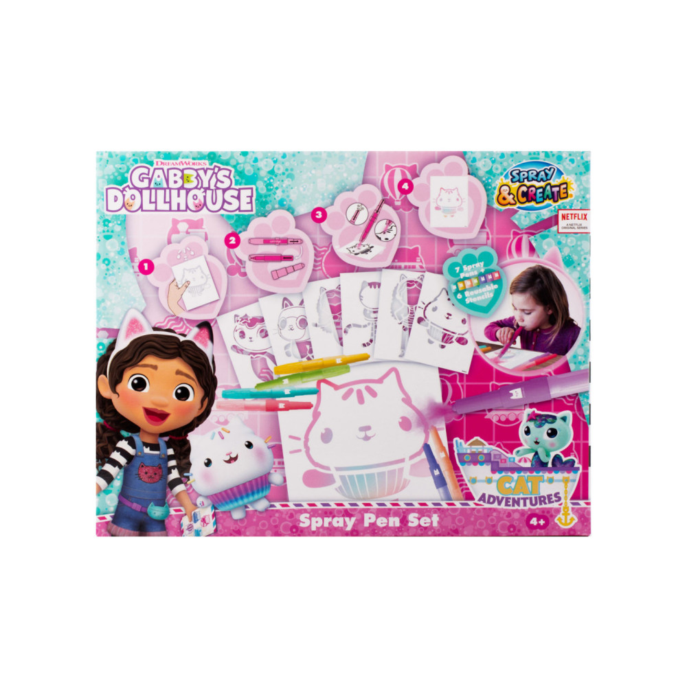 Inclusief in het set zijn 6 herbruikbare stencils, elk geïnspireerd door de geliefde karakters uit de serie Gabby’s Poppenhuis.. Laat de creativiteit de vrije loop terwijl kinderen keer op keer unieke meesterwerken maken met deze adembenemende spray pennen.