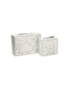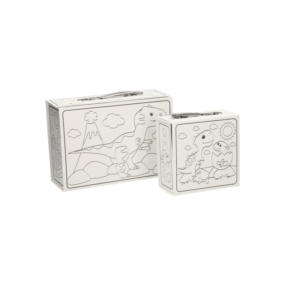 Knutselset voor het inkleuren en in elkaar zetten van 2 dinokoffers (15x15x17 cm en 25x18x9 centimeter). Geschikt voor kinderen vanaf 3 jaar oud.