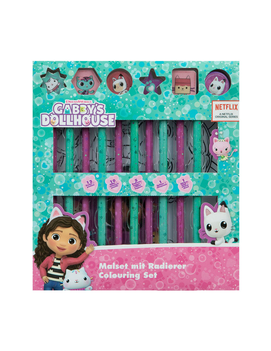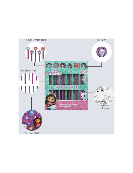 Kleurset Gabby's Poppenhuis. Inhoud: 1 puntenslijper, 12 kleurplaten, 1 stickervel, 10 kleurpotloden, 5 gummen.