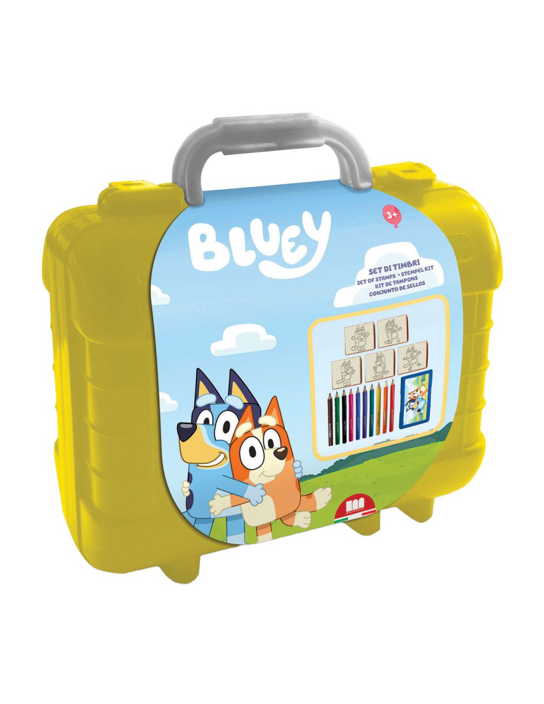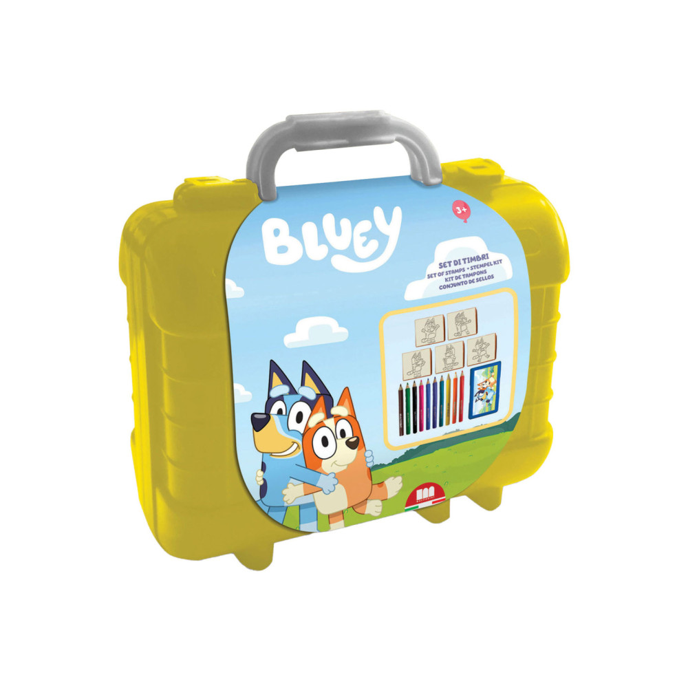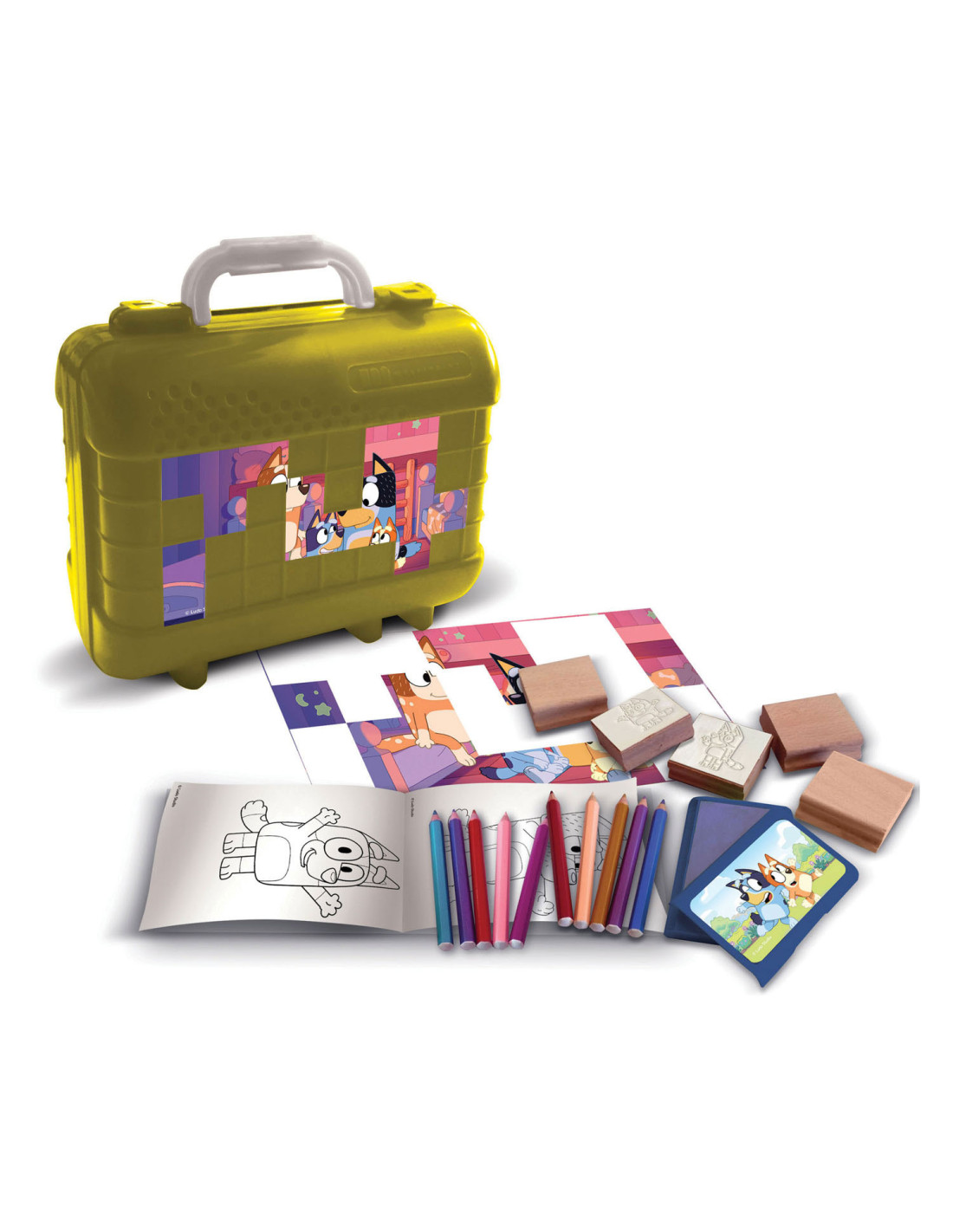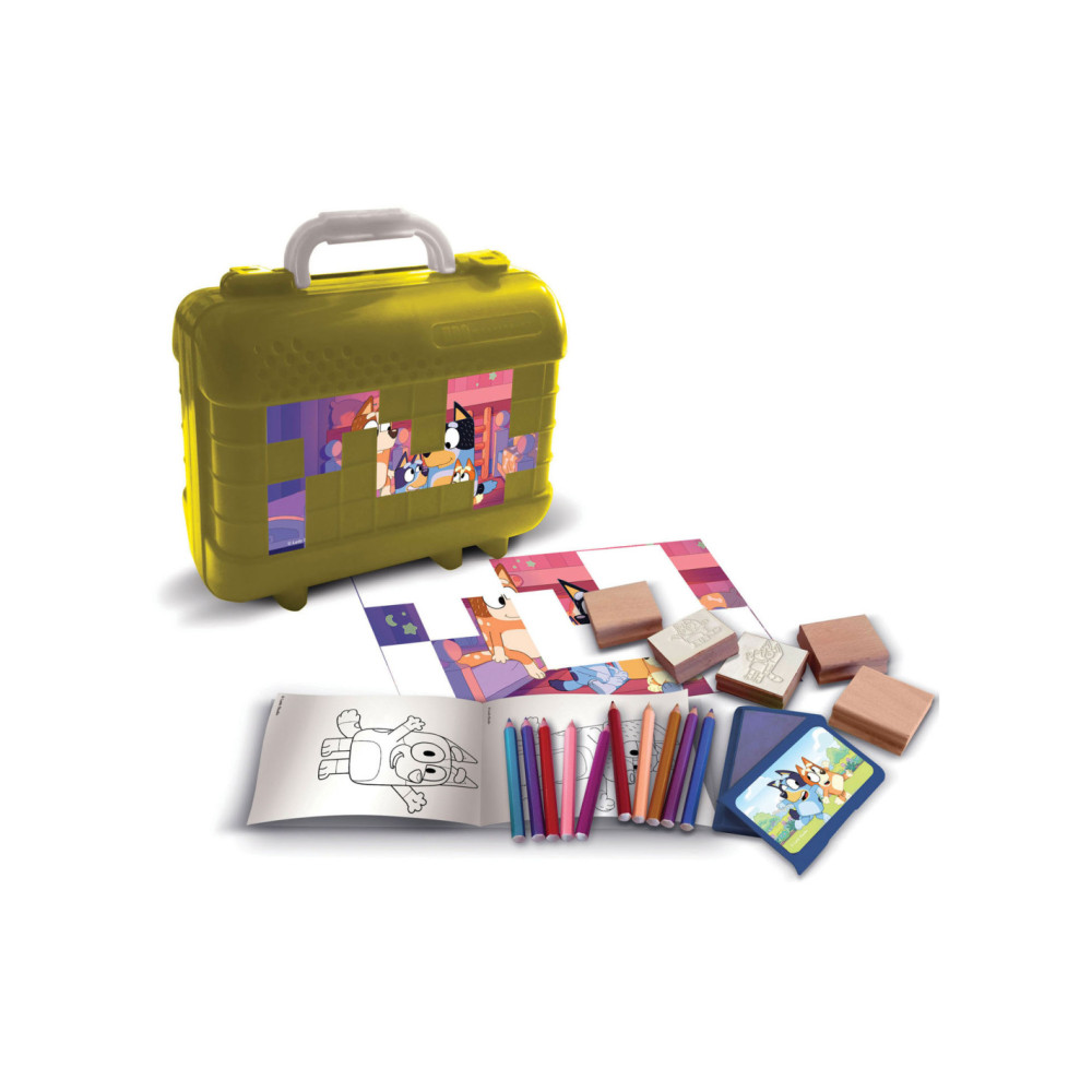 Inhoud: 10 kleurpotloden, 1 wasbaar niet-giftig stempelkussen, 5 houten stempels, 1 activiteitenboek en 64 puzzelstickers. Deze puzzelstickers plak je aan de buitenkant van je koffer en vormen een afbeelding van je Bluey.
