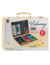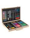 Houten kleurkoffer met handvat en 86 onderdelen: stiften, waskrijtjes, verf, potloden en diverse accessoires zoals een schaar, liniaal en puntenslijper.