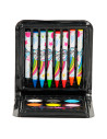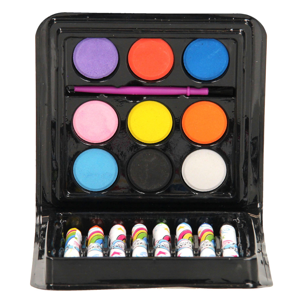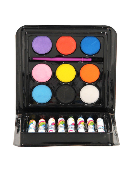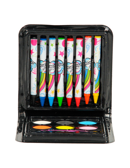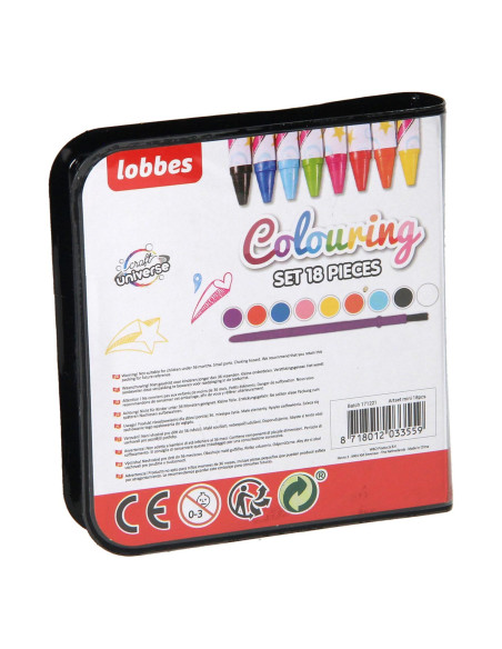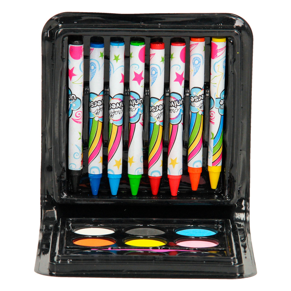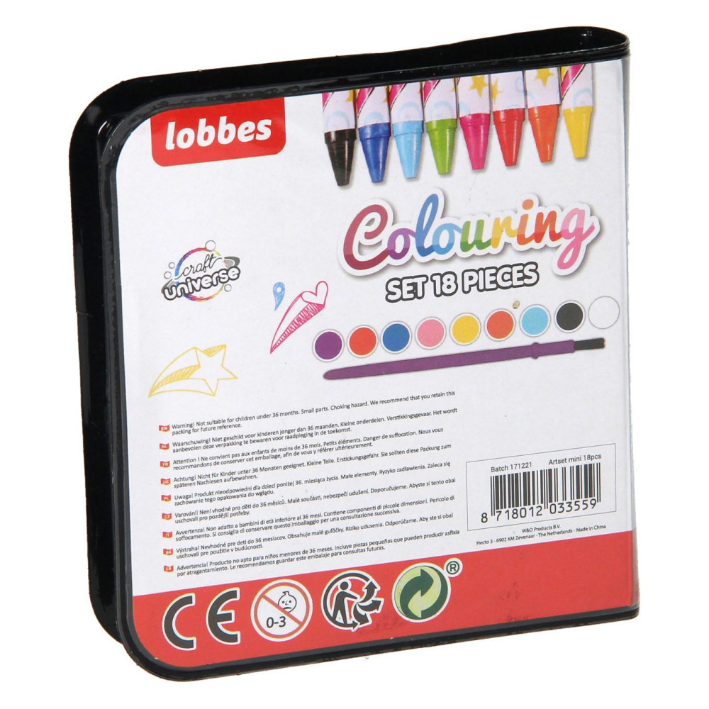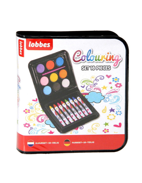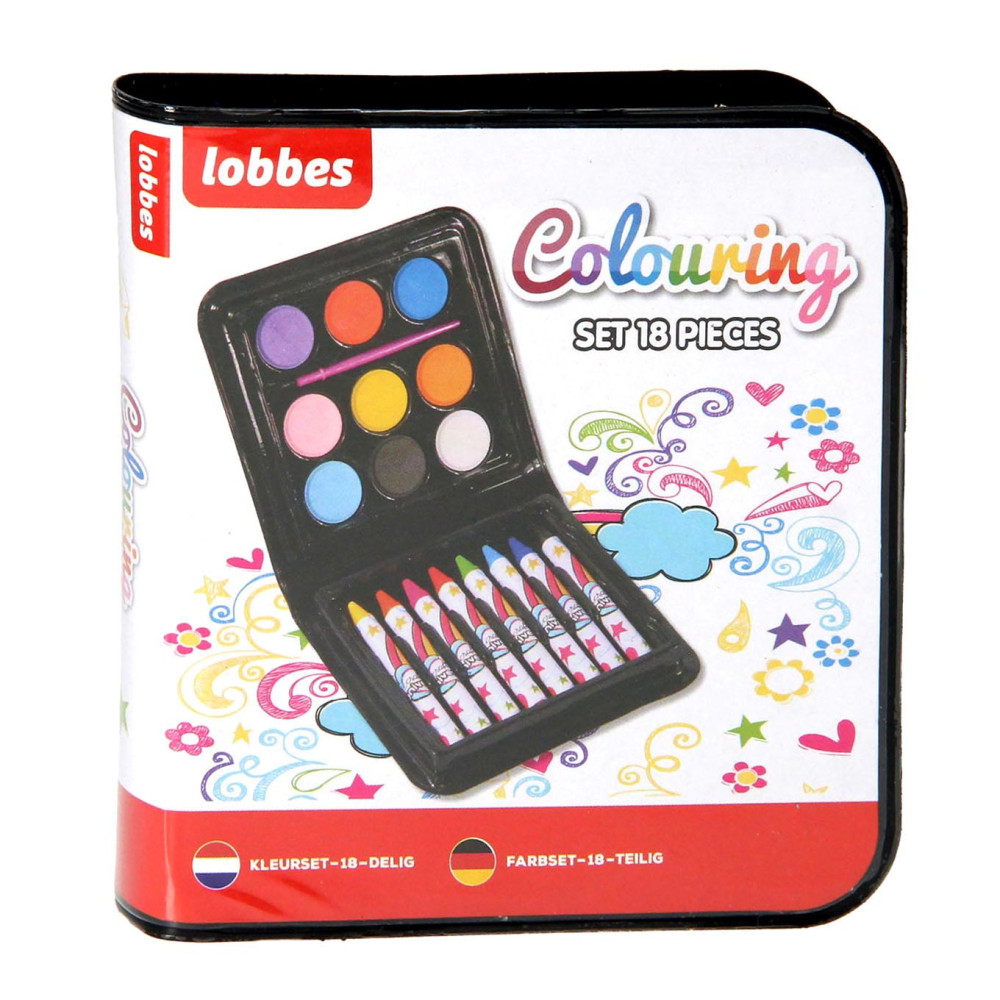 Deze leuke kleine kleurkoffer is ideaal om mee te nemen op vakantie of als je gaat logeren. De kleurkoffer bestaat uit verf, een verfkwast en verschillende kleurrijke krijtjes. Maak de mooiste schilderijen, tekeningen en creaties met deze 18delige set!