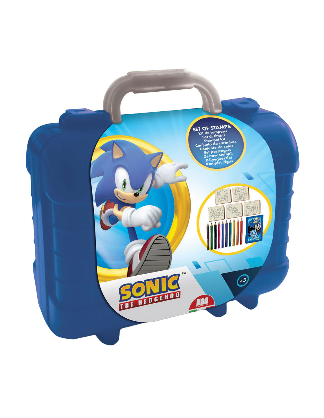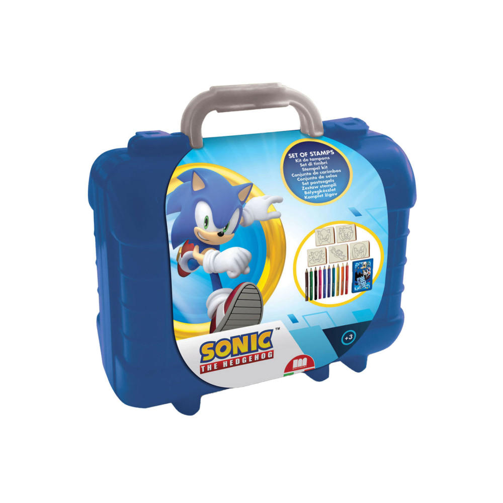 Kunststof Sonic koffer met 5 Sonic-stempels, een stempelkussen, 10 kleurpotloden en Sonic-stickers. Afmetingen: 23 x 20 x 12 centimeter. Geschikt vanaf 3 jaar.