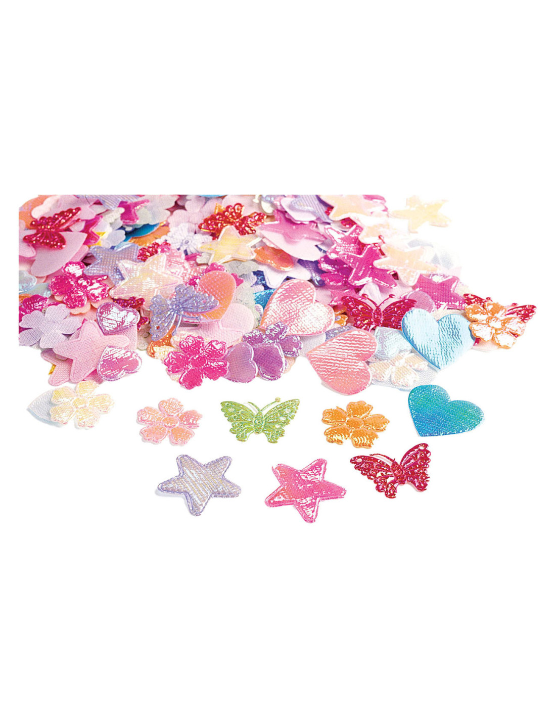 tot 2,5 cm. Plat voor gemakkelijk lijmen. De set bevat vlinders, bloemen, harten en sterren in diverse iriserende kleuren.