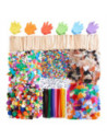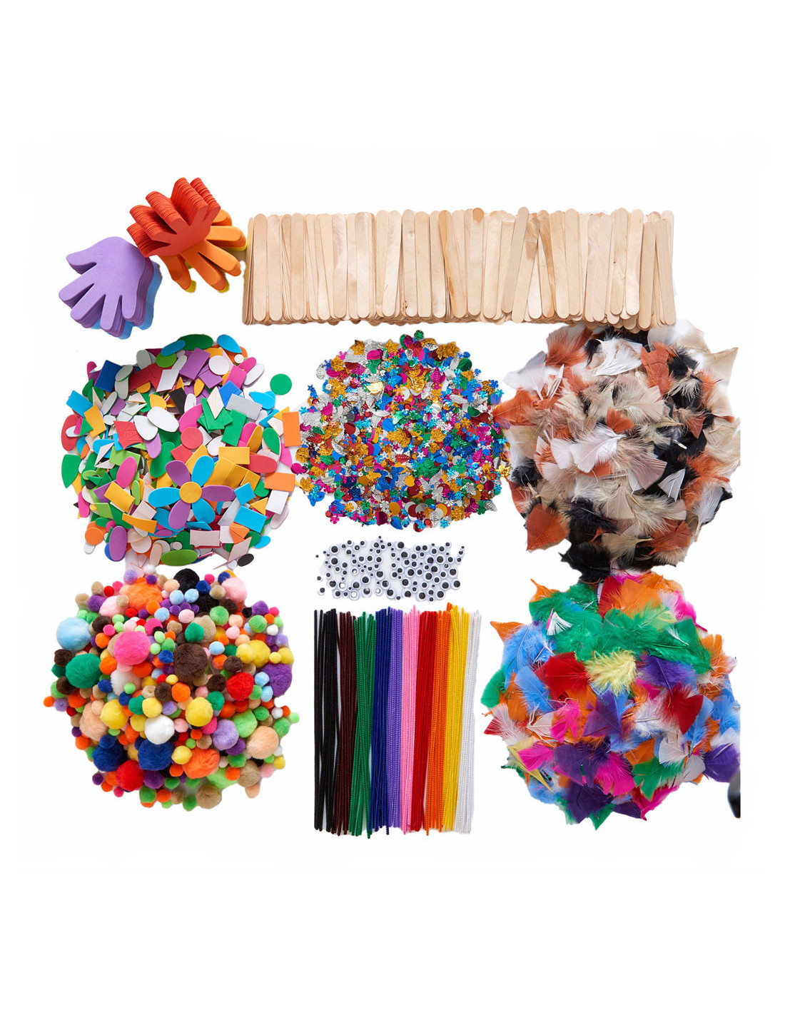 schuimvormen, 150 handschuimvormen, 100 verschillende zwarte wiebeloogjes, 500 grote natuurlijke knutselstokjes, 110 gram pailletten, 85 gram veren in regenboogkleur en 85 gram veren in natuurlijke kleur. De mogelijkheden zijn eindeloos om te vormen, lijmen en creëren met deze startset knutselspullen!